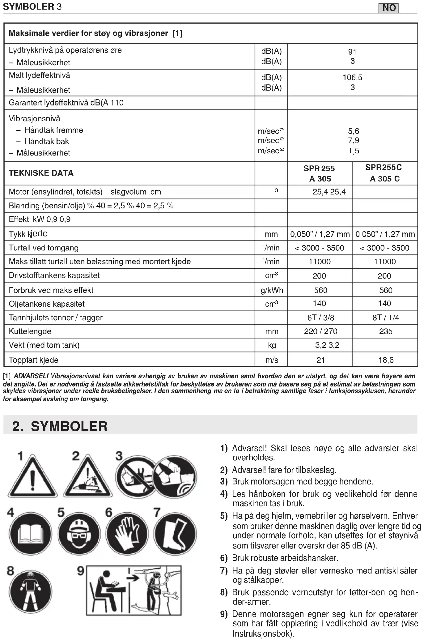 Tannhjulets tenner / tagger 6T / 3/8 8T / 1/4 Kuttelengde mm 220 / 270 235 Vekt (med tom tank) kg 3,2 3,2 Toppfart kjede m/s 21 18,6 [1] ADVARSEL! Vibrasjonsnivået kan variere avhengig av bruken av maskinen samt hvordan den er utstyrt, og det kan være høyere enn det angitte. Det er nødvendig å fastsette sikkerhetstiltak for beskyttelse av brukeren som må basere seg på et estimat av belastningen som skyldes vi bra sjoner under reelle bruksbetingelser. I den sammenheng må en ta i betraktning samtlige faser i funksjonssyklusen, herunder for eksempel avslåing om tomgang.