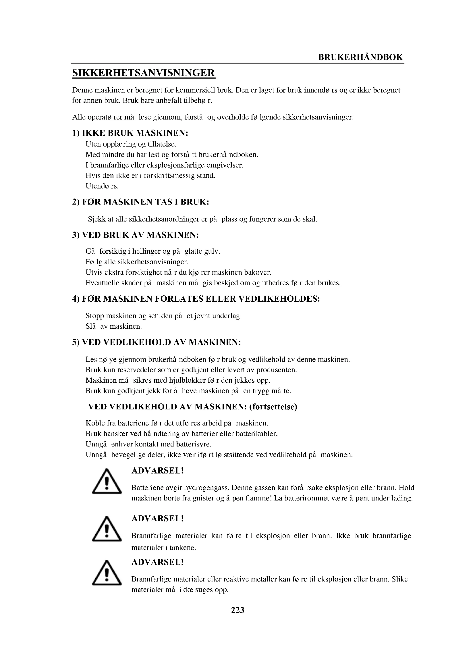 Les nøye gjennom brukerhåndboken før bruk og vedlikehold av denne maskinen. Bruk kun reservedeler som er godkjent eller levert av produsenten. Maskinen må sikres med hjulblokker før den jekkes opp. Bruk kun godkjent jekk for å heve maskinen på en trygg måte. VED VEDLIKEHOLD AV MASKINEN: (fortsettelse) Koble fra batteriene før det utføres arbeid på maskinen. Bruk hansker ved håndtering av batterier eller batterikabler. Unngå enhver kontakt med batterisyre. Unngå bevegelige deler, ikke vær iført løstsittende ved vedlikehold på maskinen. ADVARSEL! Batteriene avgir hydrogengass. Denne gassen kan forårsake eksplosjon eller brann. Hold maskinen borte fra gnister og åpen flamme! La batterirommet være åpent under lading. ADVARSEL! Brannfarlige materialer kan føre til eksplosjon eller brann. Ikke bruk brannfarlige materialer i tankene. ADVARSEL! Brannfarlige materialer eller reaktive metaller kan føre til eksplosjon eller brann. Slike materialer må ikke suges opp.BRUKERHÅNDBOK
