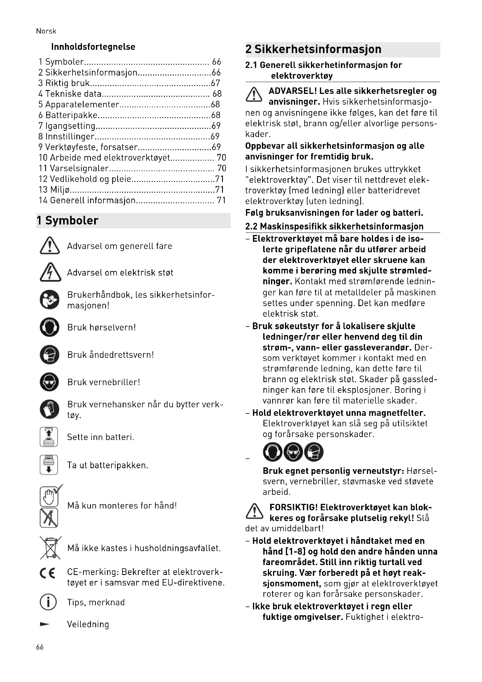 elektroverktøy ADVARSEL! Les alle sikkerhetsregler og anvisninger. Hvis sikkerhetsinformasjo nen og anvisningene ikke følges, kan det føre til elektrisk støt, brann og/eller alvorlige persons kader. Oppbevar all sikkerhetsinformasjon og alle anvisninger for fremtidig bruk. I sikkerhetsinformasjonen brukes uttrykket "elektroverktøy". Det viser til nettdrevet elek troverktøy (med ledning) eller batteridrevet elektroverktøy (uten ledning). Følg bruksanvisningen for lader og batteri.