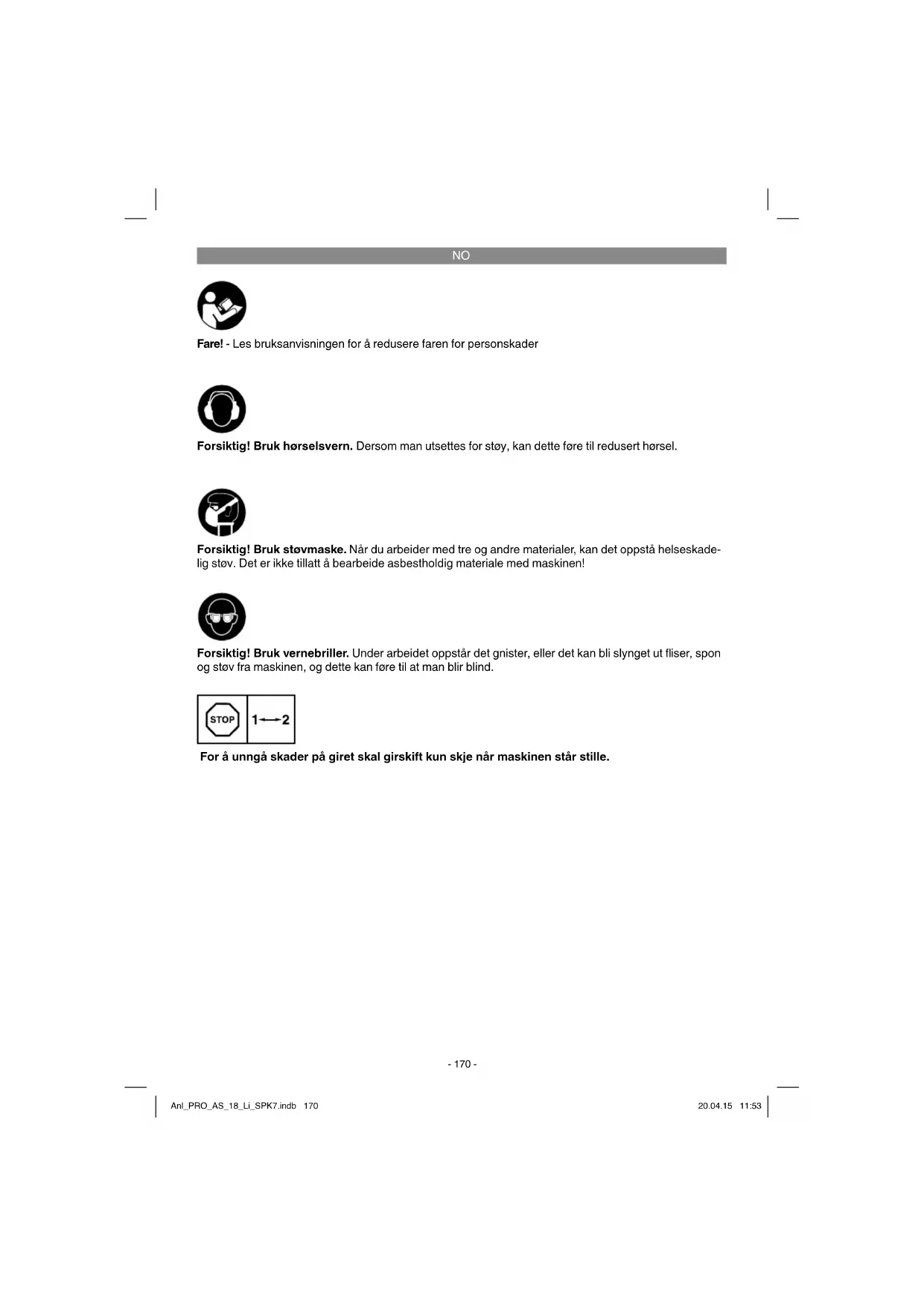 Fare! - Les bruksanvisningen for å redusere faren for personskader Forsiktig! Bruk hørselsvern. Dersom man utsettes for støy, kan dette føre til redusert hørsel. Forsiktig! Bruk vernebriller. Under arbeidet oppstår det gnister, eller det kan bli slynget ut fl iser, spon og støv fra maskinen, og dette kan føre til at man blir blind. Forsiktig! Bruk støvmaske. Når du arbeider med tre og andre materialer, kan det oppstå helseskade- lig støv. Det er ikke tillatt å bearbeide asbestholdig materiale med maskinen! For å unngå skader på giret skal girskift kun skje når maskinen står stille. Anl_PRO_AS_18_Li_SPK7.indb 170Anl_PRO_AS_18_Li_SPK7.indb 170 20.04.15 11:5320.04.15 11:53NO