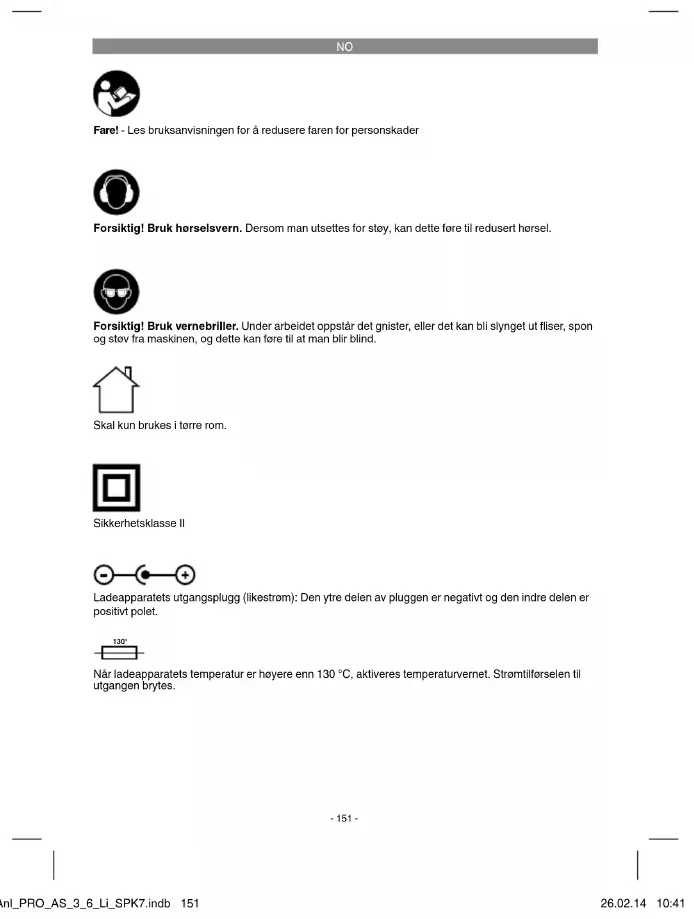Fare! - Les bruksanvisningen for å redusere faren for personskader Forsiktig! Bruk hørselsvern. Dersom man utsettes for støy, kan dette føre til redusert hørsel. Forsiktig! Bruk vernebriller. Under arbeidet oppstår det gnister, eller det kan bli slynget ut fl iser, spon og støv fra maskinen, og dette kan føre til at man blir blind. Skal kun brukes i tørre rom. Sikkerhetsklasse II Ladeapparatets utgangsplugg (likestrøm): Den ytre delen av pluggen er negativt og den indre delen er positivt polet. 130° Når ladeapparatets temperatur er høyere enn 130 °C, aktiveres temperaturvernet. Strømtilførselen til utgangen brytes. Anl_PRO_AS_3_6_Li_SPK7.indb 151Anl_PRO_AS_3_6_Li_SPK7.indb 151 26.02.14 10:4126.02.14 10:41NO