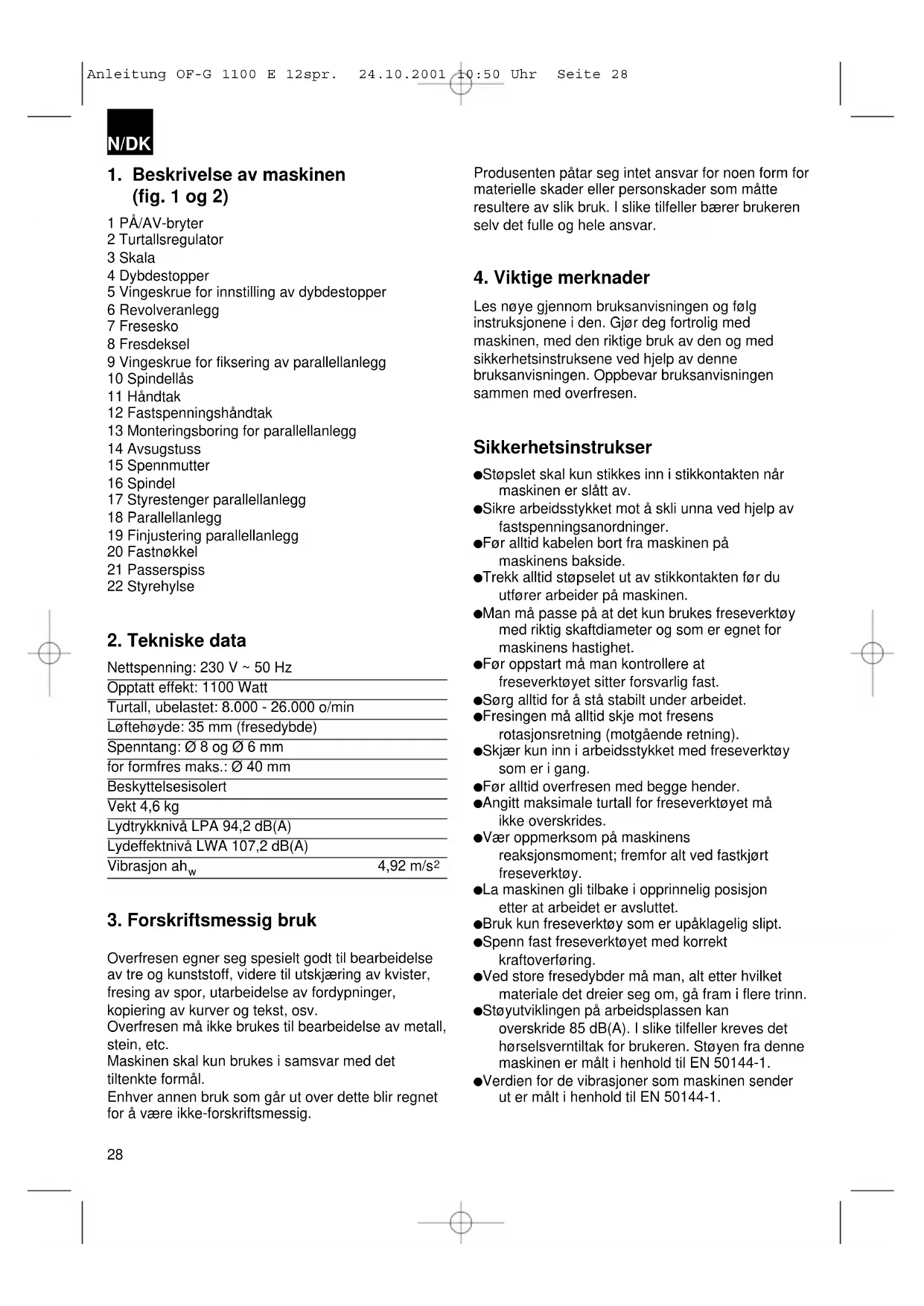 Les nøye gjennom bruksanvisningen og følg instruksjonene i den. Gjør deg fortrolig med maskinen, med den riktige bruk av den og med sikkerhetsinstruksene ved hjelp av denne bruksanvisningen. Oppbevar bruksanvisningen sammen med overfresen. Sikkerhetsinstrukser Støpslet skal kun stikkes inn i stikkontakten når maskinen er slått av. Sikre arbeidsstykket mot å skli unna ved hjelp av fastspenningsanordninger. Før alltid kabelen bort fra maskinen på maskinens bakside. Trekk alltid støpselet ut av stikkontakten før du utfører arbeider på maskinen. Man må passe på at det kun brukes freseverktøy med riktig skaftdiameter og som er egnet for maskinens hastighet. Før oppstart må man kontrollere at freseverktøyet sitter forsvarlig fast. Sørg alltid for å stå stabilt under arbeidet. Fresingen må alltid skje mot fresens rotasjonsretning (motgående retning). Skjær kun inn i arbeidsstykket med freseverktøy som er i gang. Før alltid overfresen med begge hender. Angitt maksimale turtall for freseverktøyet må ikke overskrides. Vær oppmerksom på maskinens reaksjonsmoment; fremfor alt ved fastkjørt freseverktøy. La maskinen gli tilbake i opprinnelig posisjon etter at arbeidet er avsluttet. Bruk kun freseverktøy som er upåklagelig slipt. Spenn fast freseverktøyet med korrekt kraftoverføring. Ved store fresedybder må man, alt etter hvilket materiale det dreier seg om, gå fram i flere trinn. Støyutviklingen på arbeidsplassen kan overskride 85 dB(A). I slike tilfeller kreves det hørselsverntiltak for brukeren. Støyen fra denne maskinen er målt i henhold til EN 50144-1. Verdien for de vibrasjoner som maskinen sender ut er målt i henhold til EN 50144-1. N/DK