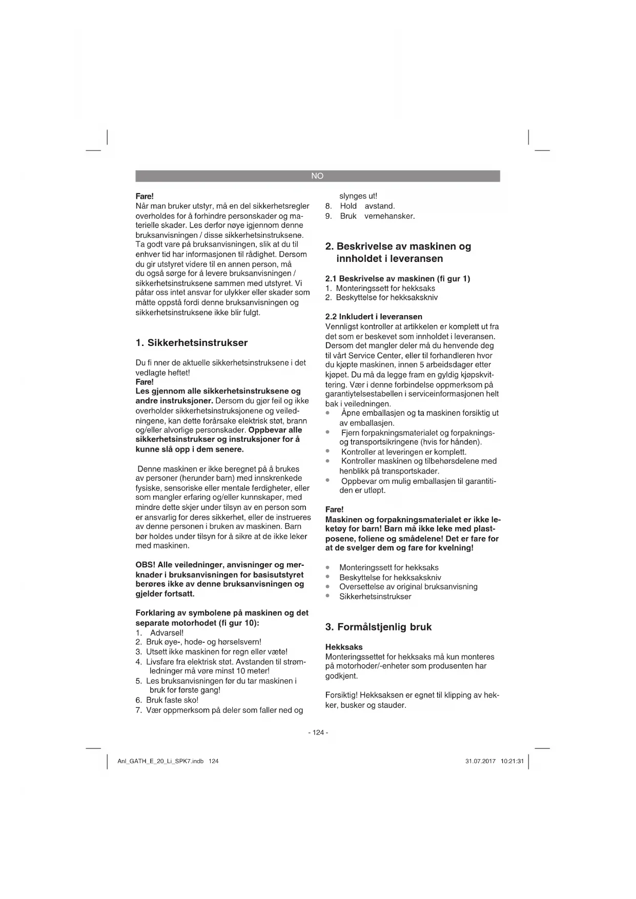 Utstyret er pakket inn i emballasje for å forhindre transportskader. Denne emballasjen er et råstoff og kan dermed brukes om igjen, eller den kan føres tilbake til råstoff kretsløpet. Maskinen og tilbehøret består av ulike materialer, f.eks. metall og kunststoff er. Defekte maskiner skal ikke kastes i husholdningsavfallet. Maskinen bør leveres inn til et egnet depot for forskriftsmessig avfallsbe- handling. Spør hos kommuneadministrasjonen, dersom du ikke vet hvor et slikt deponi fi nnes. Anl_GATH_E_20_Li_SPK7.indb 126Anl_GATH_E_20_Li_SPK7.indb 126 31.07.2017 10:21:3231.07.2017 10:21:32NO
