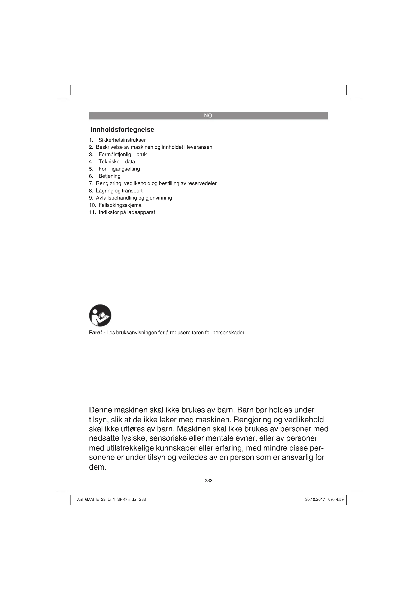 Innholdsfortegnelse Denne maskinen skal ikke brukes av barn. Barn bør holdes under tilsyn, slik at de ikke leker med maskinen. Rengjøring og vedlikehold skal ikke utføres av barn. Maskinen skal ikke brukes av personer med nedsatte fysiske, sensoriske eller mentale evner, eller av personer med utilstrekkelige kunnskaper eller erfaring, med mindre disse per- sonene er under tilsyn og veiledes av en person som er ansvarlig for dem. Fare! - Les bruksanvisningen for å redusere faren for personskader