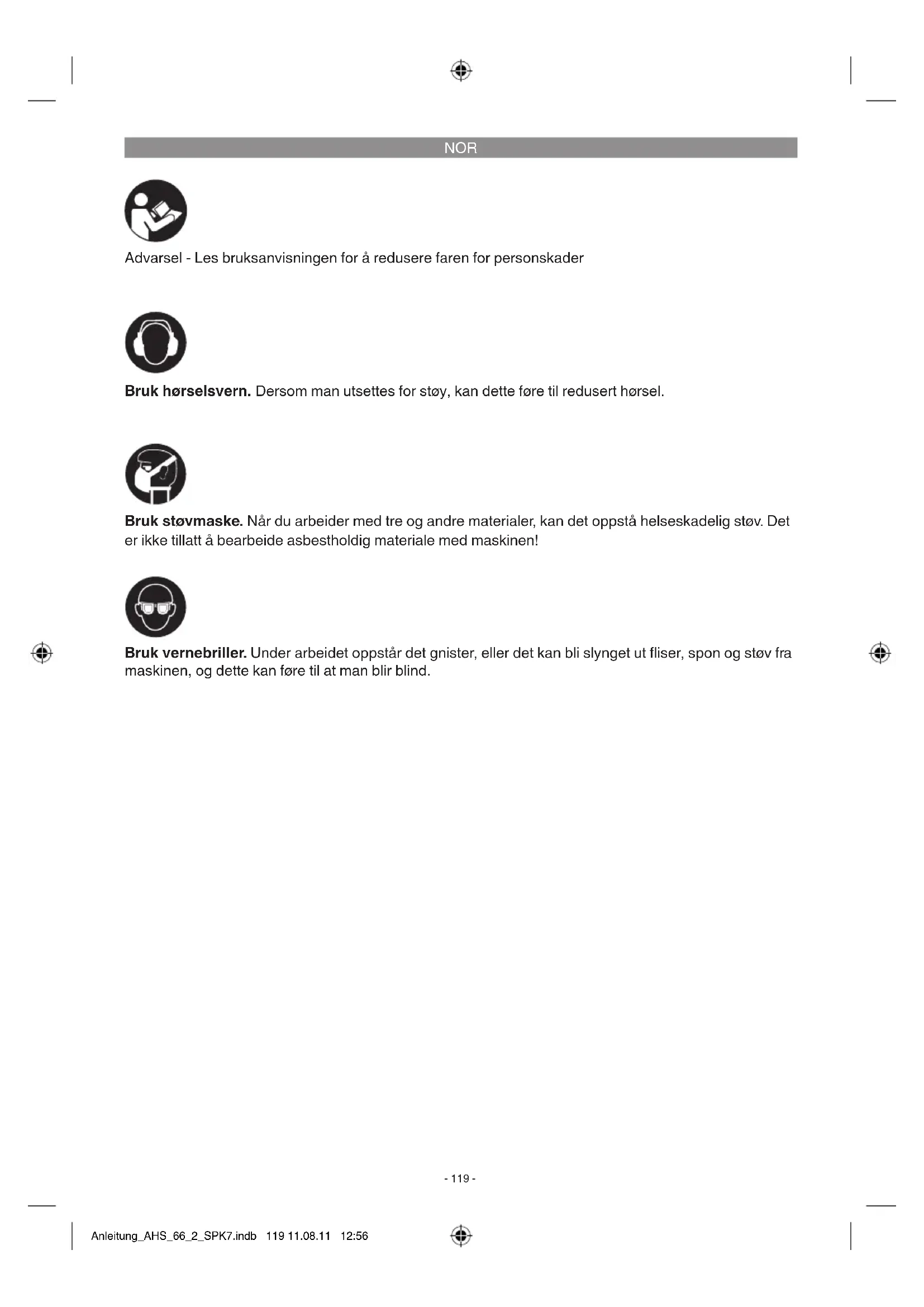 Advarsel - Les bruksanvisningen for å redusere faren for personskader Bruk hørselsvern. Dersom man utsettes for støy, kan dette føre til redusert hørsel. Bruk vernebriller. Under arbeidet oppstår det gnister, eller det kan bli slynget ut iser, spon og støv fra maskinen, og dette kan føre til at man blir blind. Bruk støvmaske. Når du arbeider med tre og andre materialer, kan det oppstå helseskadelig støv. Det er ikke tillatt å bearbeide asbestholdig materiale med maskinen! Anleitung_AHS_66_2_SPK7.indb 119 11.08.11 12:56NOR