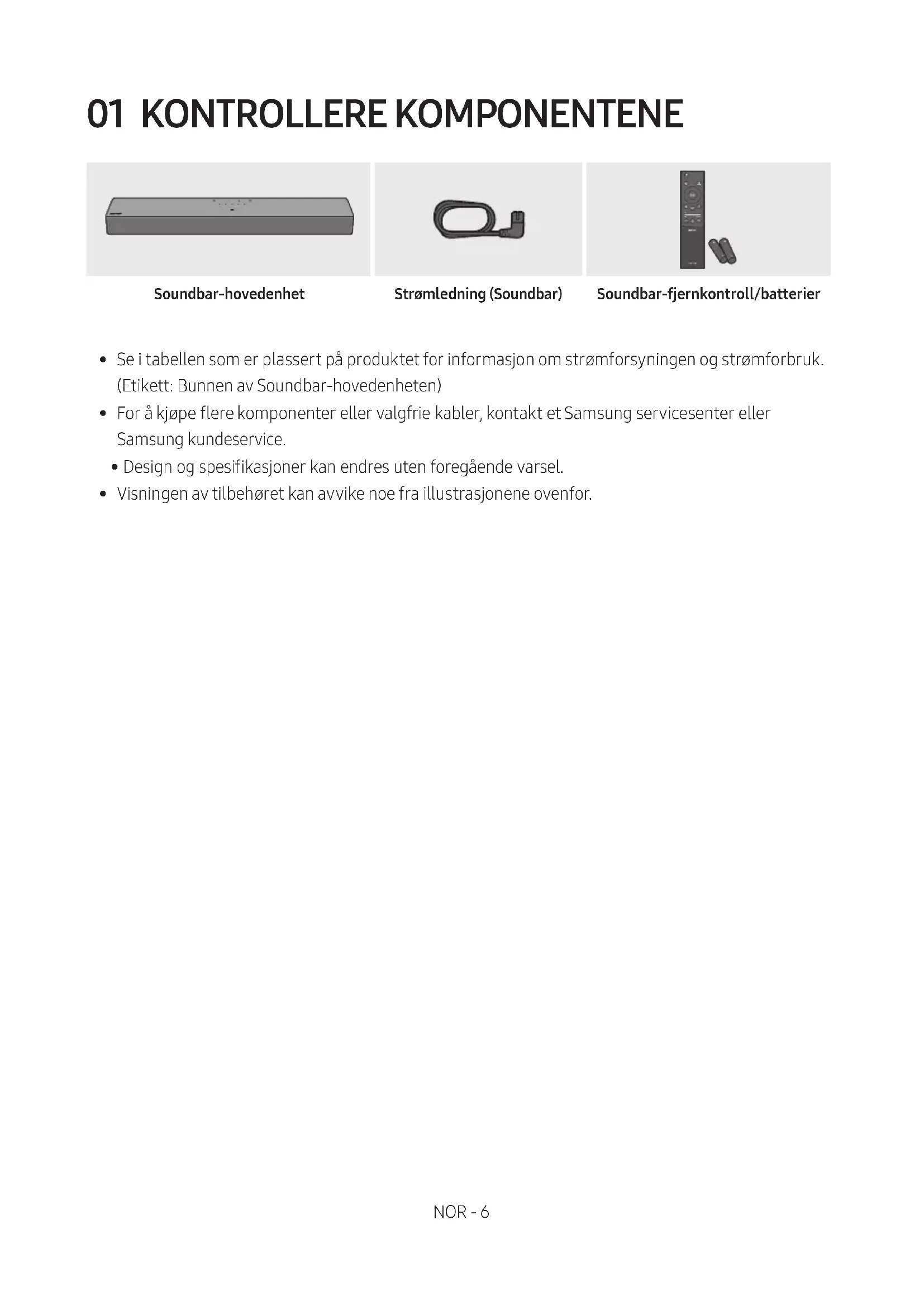 inneholder kjemikalier som er miljøskadelige. Ikke kast batteriene i restavfallet. Ikke kast batteriene i åpen ild. Ikke kortslutt, demonter eller overoppheter batteriene. FORSIKTIG : Det er fare for eksplosjon hvis batteriet ikke byttes ut riktig. Bytt det bare ut med samme eller tilsvarende type.NOR - 4 INNHOLD 01 Kontrollere komponentene 6 02 Produktoversikt 7 Toppanel på Soundbar