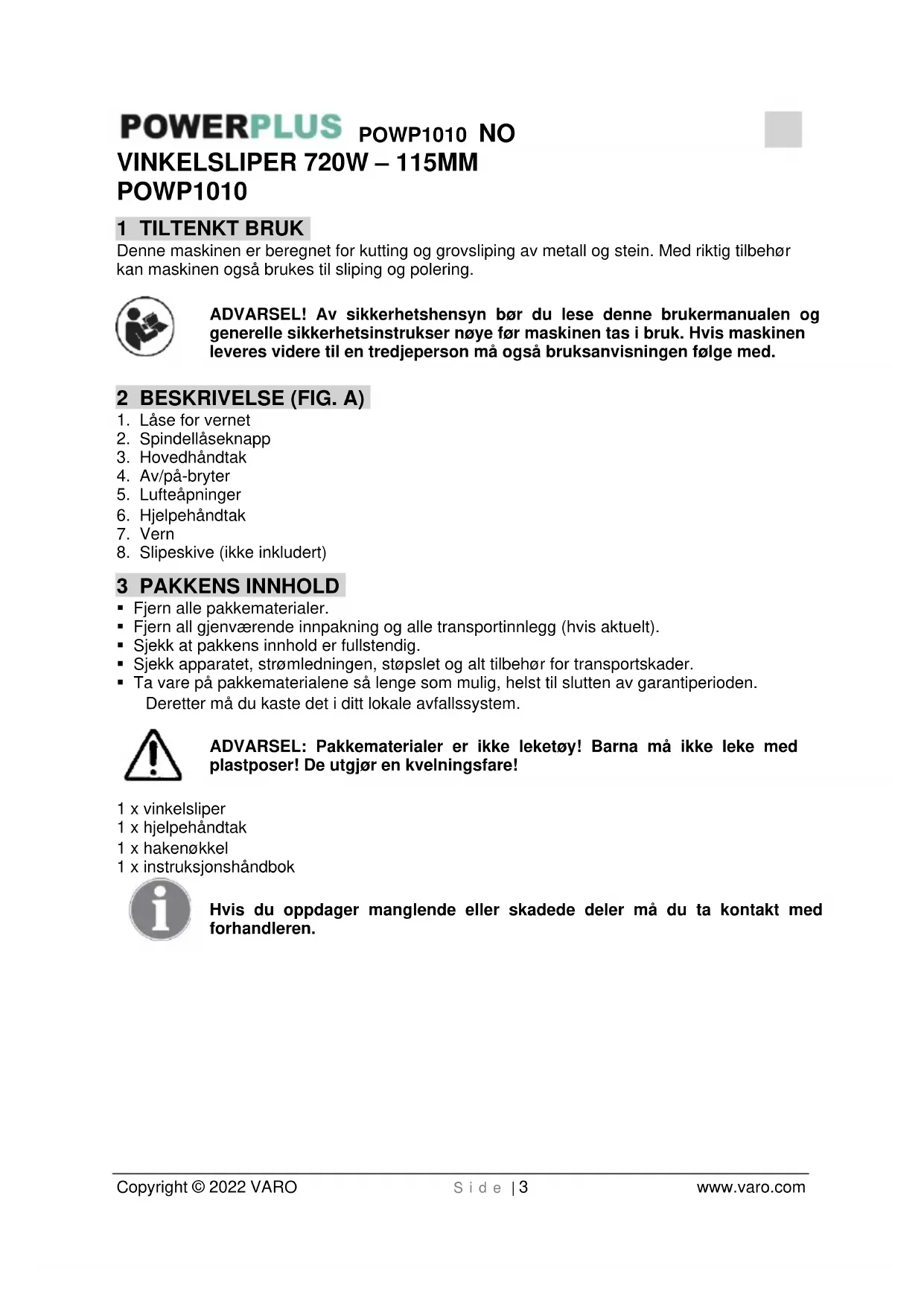 - For høyrehåndsbruk settes sidehåndtaket på venstre side av maskinen.POWP1010 NO Copyright © 2022 VARO S i d e | 7 www.varo.com