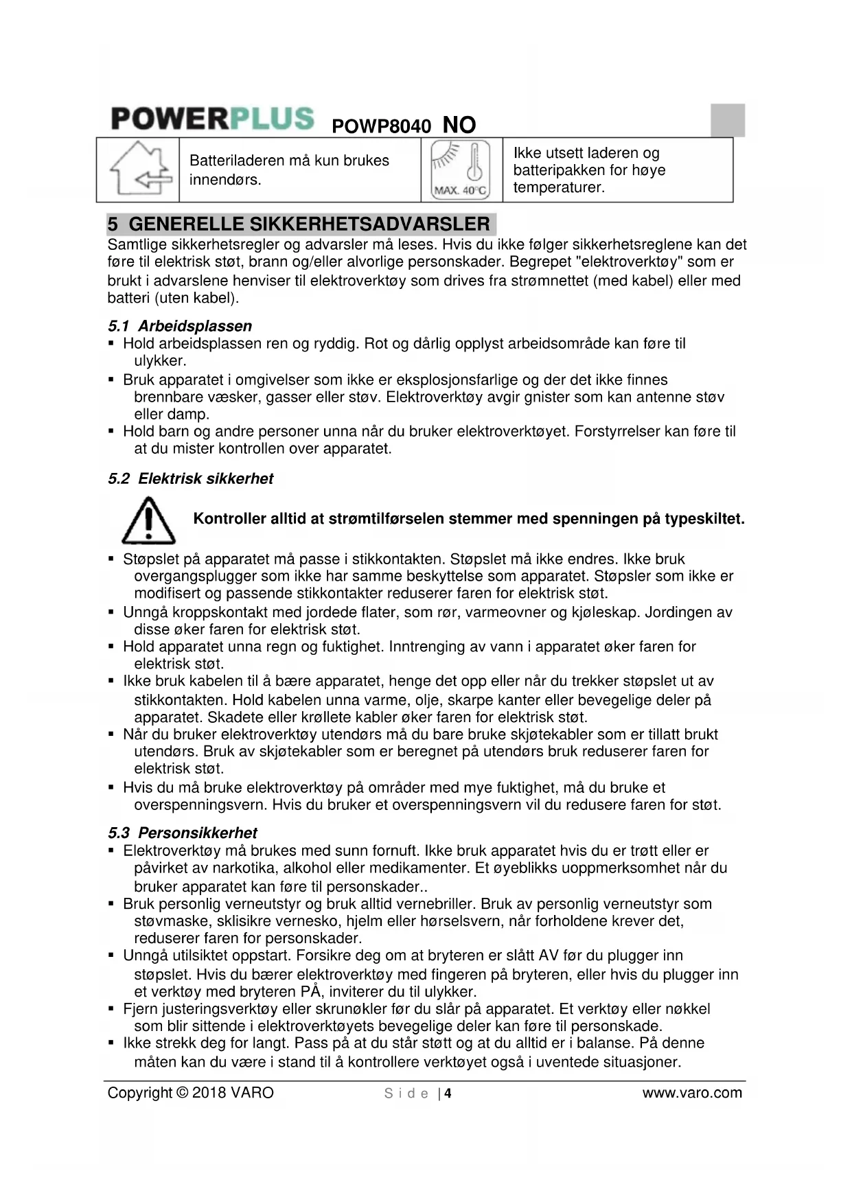 - Ikke strekk deg for langt. Pass på at du står støtt og at du alltid er i balanse. På denne måten kan du være i stand til å kontrollere verktøyet også i uventede situasjoner.POWP8040 NO Copyright © 2018 VARO S i d e | 5 www.varo.com