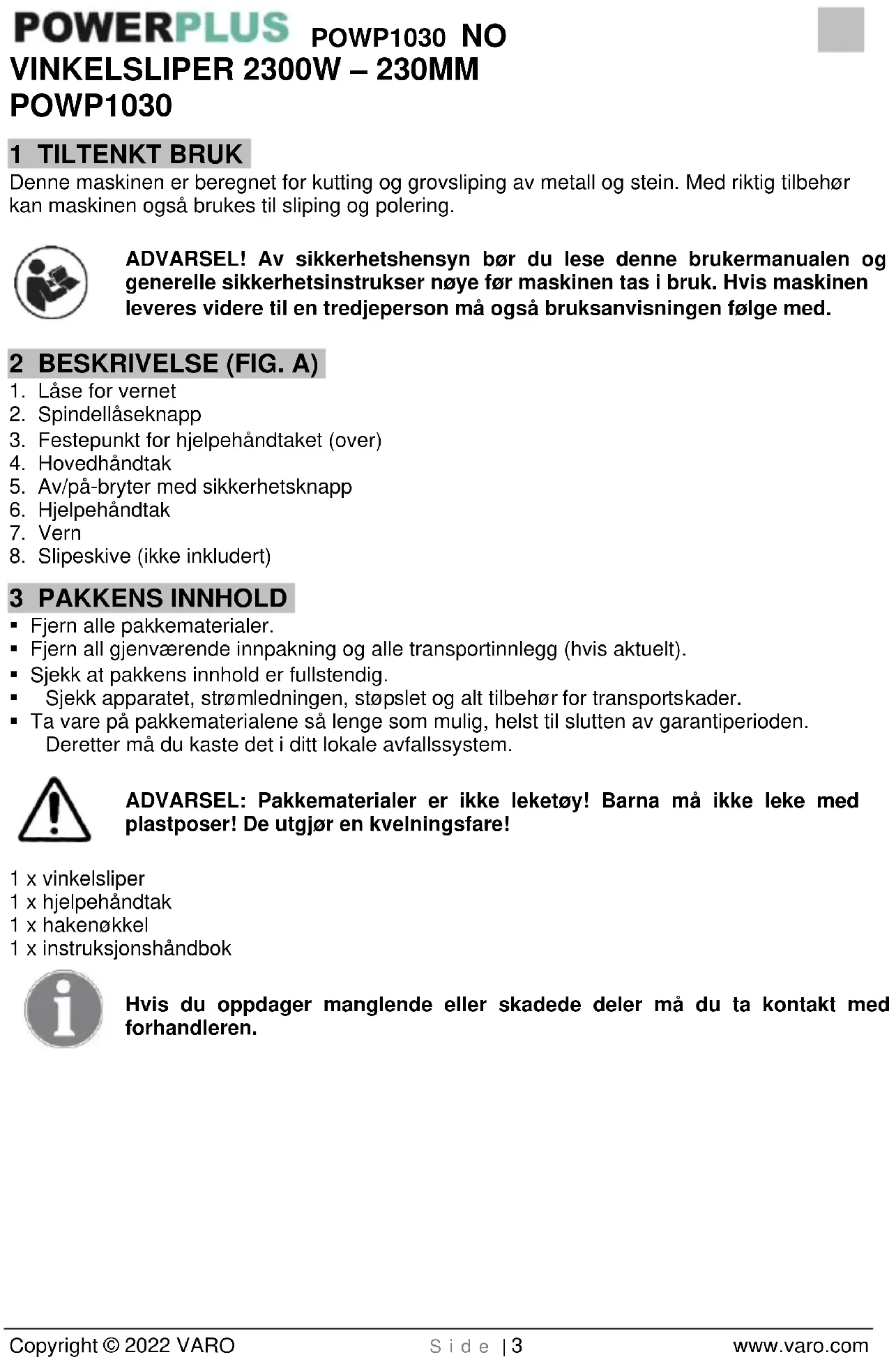 - Hvis du må bruke elektroverktøy på områder med mye fuktighet, må du bruke et overspenningsvern. Hvis du bruker et overspenningsvern vil du redusere faren for støt.POWP1030 NO Copyright © 2022 VARO S i d e | 5 www.varo.com