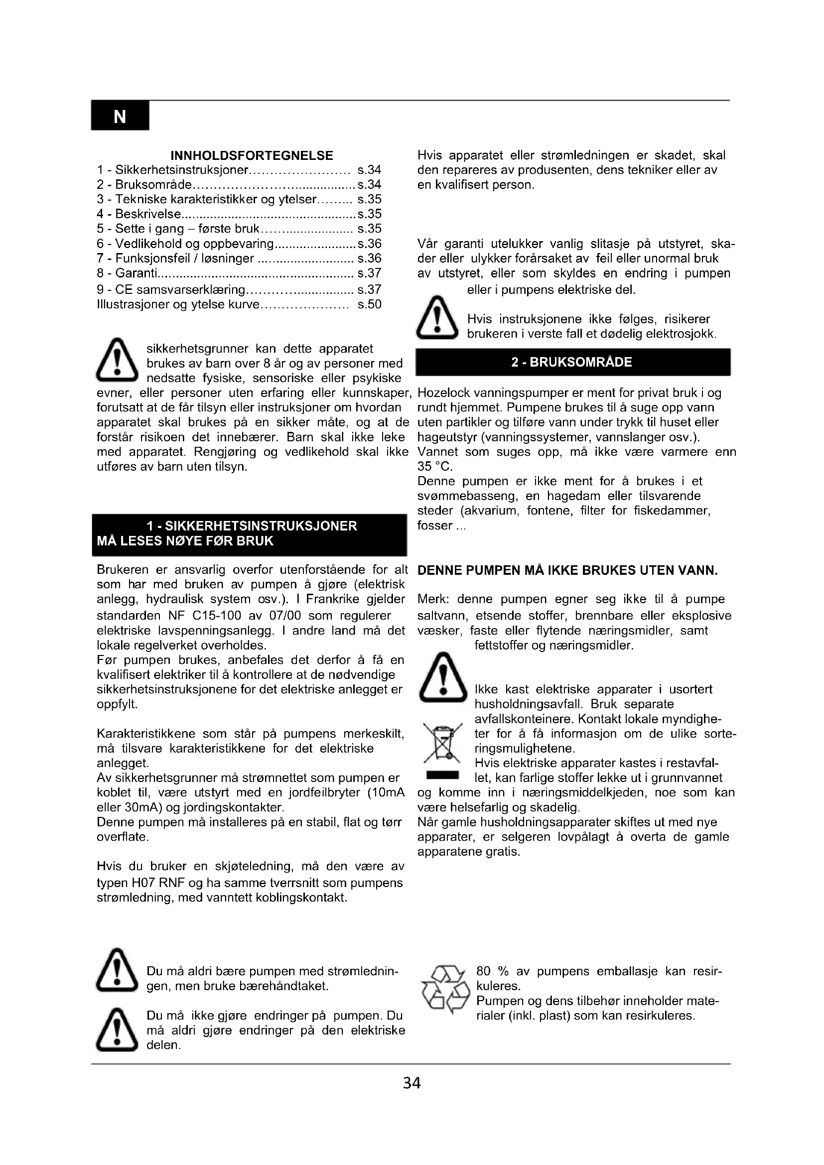 Vår garanti utelukker vanlig slitasje på utstyret, ska- der eller ulykker forårsaket av feil eller unormal bruk av utstyret, eller som skyldes en endring i pumpen eller i pumpens elektriske del. Hvis instruksjonene ikke følges, risikerer brukeren i verste fall et dødelig elektrosjokk.