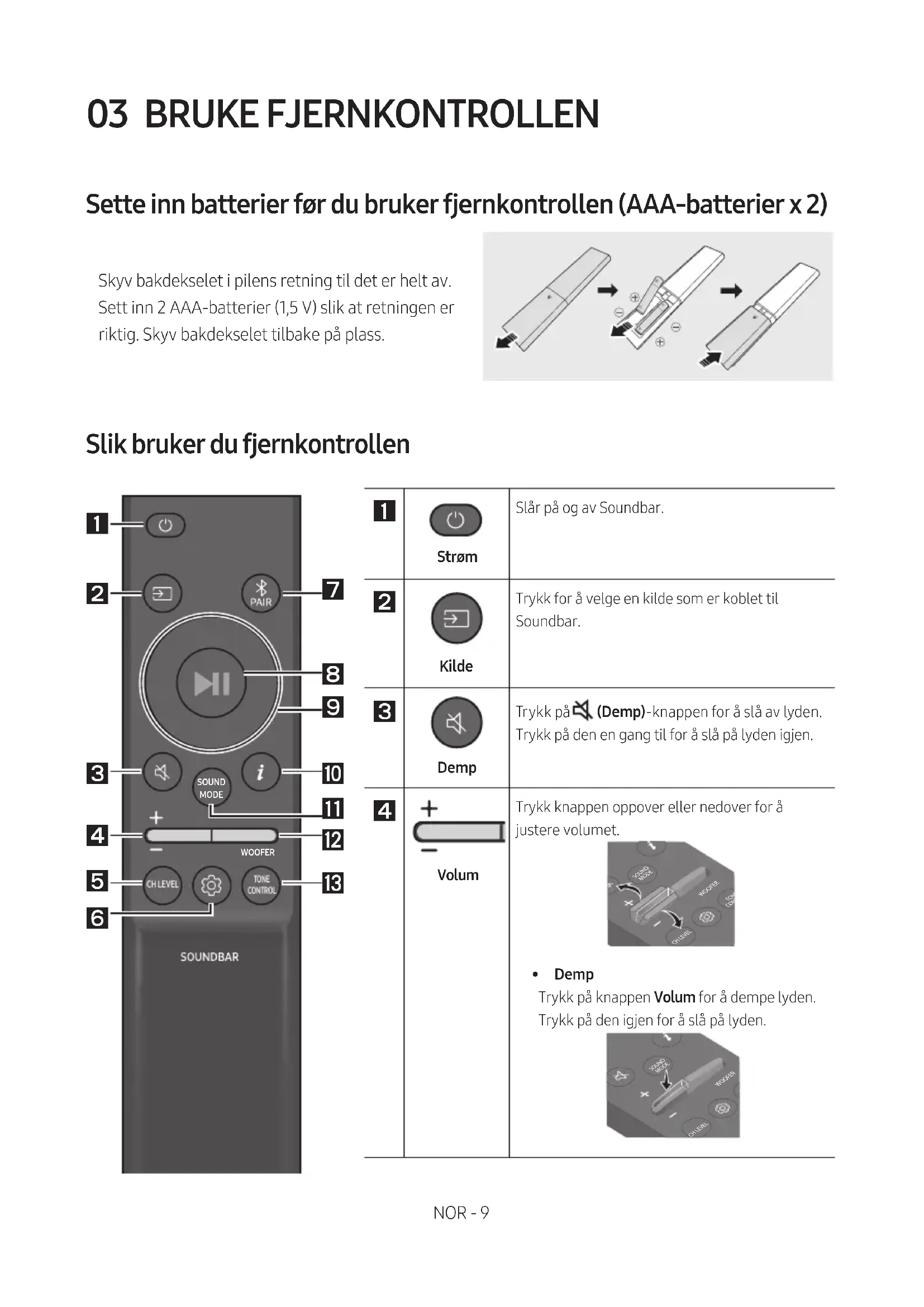 inneholder kjemikalier som er miljøskadelige. Ikke kast batteriene i restavfallet. Ikke kast batteriene i åpen ild. Ikke kortslutt, demonter eller overoppheter batteriene. FORSIKTIG : Det er fare for eksplosjon hvis batteriet ikke byttes ut riktig. Bytt det bare ut med samme eller tilsvarende type.NOR - 4 INNHOLD 01 Kontrollere komponentene 6 02 Produkoversikt 7 Frontpanel/toppanel på Soundbar ------------------------- 7 Nedre panel i Soundbar ------------------------- 8 03 Bruke fjernkontrollen 9 Sette inn batterier før du bruker fjernkontrollen (AAA-batterier x 2) ------------------------- 9 Slik bruker du fjernkontrollen