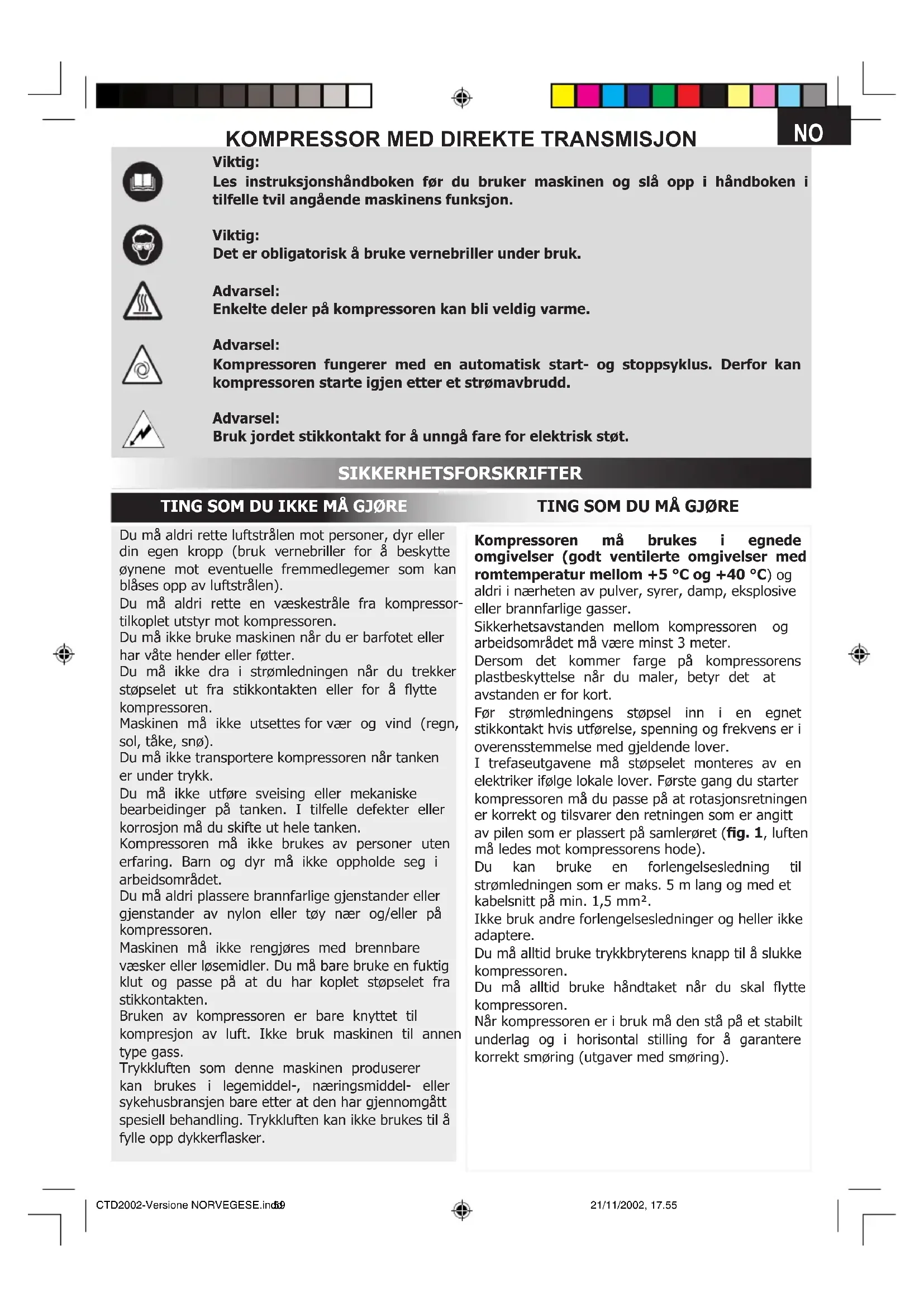 Viktig:Les instruksjonshåndboken før du bruker maskinen og slå opp i håndboken i tilfelle tvil angående maskinens funksjon.Viktig:Det er obligatorisk å bruke vernebriller under bruk.Advarsel:Enkelte deler på kompressoren kan bli veldig varme.Advarsel: Kompressoren fungerer med en automatisk start- og stoppsyklus. Derfor kan kompressoren starte igjen etter et strømavbrudd.Advarsel:Bruk jordet stikkontakt for å unngå fare for elektrisk støt. SIKKERHETSFORSKRIFTER Du må aldri rette luftstrålen mot personer, dyr eller din egen kropp (bruk vernebriller for å beskytte øynene mot eventuelle fremmedlegemer som kan blåses opp av luftstrålen).Du må aldri rette en væskestråle fra kompressor- tilkoplet utstyr mot kompressoren.Du må ikke bruke maskinen når du er barfotet eller har våte hender eller føtter.Du må ikke dra i strømledningen når du trekker støpselet ut fra stikkontakten eller for å ytte kompressoren.Maskinen må ikke utsettes for vær og vind (regn, sol, tåke, snø).Du må ikke transportere kompressoren når tanken er under trykk.Du må ikke utføre sveising eller mekaniske bearbeidinger på tanken. I tilfelle defekter eller korrosjon må du skifte ut hele tanken. Kompressoren må ikke brukes av personer uten erfaring. Barn og dyr må ikke oppholde seg i arbeidsområdet. Du må aldri plassere brannfarlige gjenstander eller gjenstander av nylon eller tøy nær og/eller på kompressoren.Maskinen må ikke rengjøres med brennbare væsker eller løsemidler. Du må bare bruke en fuktig klut og passe på at du har koplet støpselet fra stikkontakten.Bruken av kompressoren er bare knyttet til kompresjon av luft. Ikke bruk maskinen til annen type gass.Trykkluften som denne maskinen produserer kan brukes i legemiddel-, næringsmiddel- eller sykehusbransjen bare etter at den har gjennomgått spesiell behandling. Trykkluften kan ikke brukes til å fylle opp dykkerasker. Kompressoren må brukes i egnede omgivelser (godt ventilerte omgivelser med romtemperatur mellom +5 °C og +40 °C) og aldri i nærheten av pulver, syrer, damp, eksplosive eller brannfarlige gasser.Sikkerhetsavstanden mellom kompressoren og arbeidsområdet må være minst 3 meter. Dersom det kommer farge på kompressorens plastbeskyttelse når du maler, betyr det at avstanden er for kort. Før strømledningens støpsel inn i en egnet stikkontakt hvis utførelse, spenning og frekvens er i overensstemmelse med gjeldende lover. I trefaseutgavene må støpselet monteres av en elektriker ifølge lokale lover. Første gang du starter kompressoren må du passe på at rotasjonsretningen er korrekt og tilsvarer den retningen som er angitt av pilen som er plassert på samlerøret (g. 1, luften må ledes mot kompressorens hode). Du kan bruke en forlengelsesledning til strømledningen som er maks. 5 m lang og med et kabelsnitt på min. 1,5 mm².Ikke bruk andre forlengelsesledninger og heller ikke adaptere.Du må alltid bruke trykkbryterens knapp til å slukke kompressoren.Du må alltid bruke håndtaket når du skal ytte kompressoren.Når kompressoren er i bruk må den stå på et stabilt underlag og i horisontal stilling for å garantere korrekt smøring (utgaver med smøring).