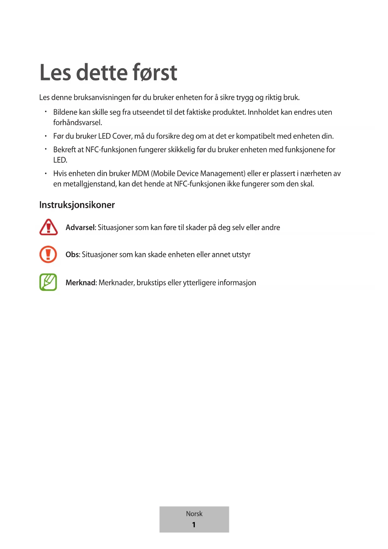 Hvis enheten din bruker MDM (Mobile Device Management) eller er plassert i nærheten av en metallgjenstand, kan det hende at NFC-funksjonen ikke fungerer som den skal. Instruksjonsikoner Advarsel: Situasjoner som kan føre til skader på deg selv eller andre Obs: Situasjoner som kan skade enheten eller annet utstyr Merknad: Merknader, brukstips eller ytterligere informasjon Norsk
