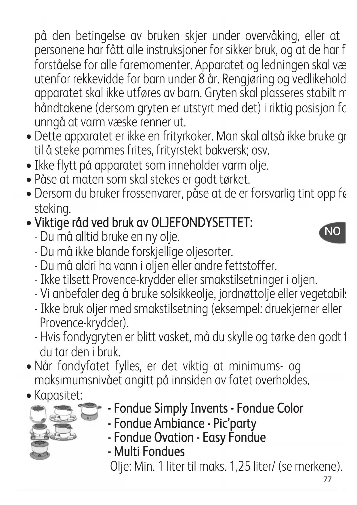 2100086671_Toutes_Fondues 08/10/14 12:13 Page7677 på den betingelse av bruken skjer under overvåking, eller at personene har fått alle instruksjoner for sikker bruk, og at de har fått forståelse for alle faremomenter. Apparatet og ledningen skal være utenfor rekkevidde for barn under 8 år. Rengjøring og vedlikehold av apparatet skal ikke utføres av barn. Gryten skal plasseres stabilt med håndtakene (dersom gryten er utstyrt med det) i riktig posisjon for å unngå at varm væske renner ut.
