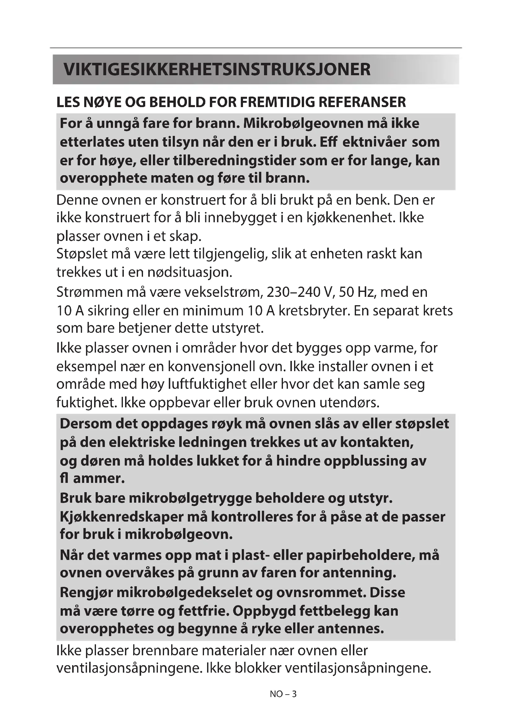 - Hold barn vekke fra døren for å unngå at de brenner seg. ADVARSEL: Barn over åtte år kan kun bruke ovnen uten overvåkning dersom tilfredsstillende instruksjon er gitt, slik at barnet er i stand til å bruke ovnen på en trygg måte og forstår farene ved feilaktig bruk. Når mikrobølgeovnen brukes i GRILL-, MIX GRILL, VARMLUFT-, MIX VARMLUFT og AUTO MENU-modus (gjeldende modus for modellen), må barn kun bruke ovnen under overvåkning av voksne på grunn av varmen som utvikles. Dette apparatet er ikke ment brukt av personer (inklusive barn) med reduserte fysiske, sensoriske og mentale NO – 8NO NO – 7 NO – 8NO – 8 evner, eller manglende erfaring og kunnskap, dersom de ikke overvåkes eller på forhånd er gitt tilfredsstillende instruksjon om bruk av apparatet av en person som er ansvarlig for deres sikkerhet. Barn må overvåkes for å sikre at de ikke leker med apparatet. Barn bør overvåkes hvis de rengjør apparatet. Modeller med elektronisk berøringspanel kommer med barnesikring. Ikke len deg mot eller heng på døren når den åpnes eller lukkes. Ikke lek med ovnen eller bruk den som en leke. Barn må læres alle viktige sikkerhetsregler: bruk grytekluter, ern lokk og forseglinger på kokekar og pakker forsiktig; vis spesiell forsiktighet ved behandling av innpakning (dvs. selvoppvarmende materialer) som skal holde maten sprø, siden de kan være ekstra varme. Andre advarsler Foreta aldri noen form for endring på ovnen. Ikke ytt ovnen mens den er i bruk. Dette apparatet skal brukes i husholdninger. Ovnen er kun ment for tilberedelse av mat i hjemmet, og skal bare brukes til å lage mat og drikke. Å tørke mat eller klær, varme opp varmeputer, tø er, svamper, fuktige kluter og lignende kan føre til skade, antennelse eller brann. Den er ikke egnet for kommersiell eller laboratorisk bruk. For å sørge for problemfri bruk av ovnen og unngå skader. Bruk aldri ovnen når den er tom. Når du bruker en bruningstallerken eller selvoppvarmende materialer, må du alltid plassere en varmebestandig isolator, som en porselentallerken, under for å unngå skade på ovnsbasen på grunn av varmebelastning. Forvarmingstiden som er spesi sert for retten må ikke overskrides. Ikke bruk kjøkkenredskaper av metall idet disse kan re ektere mikrobølgene og føre til elektriske overslag. Ikke sett bokser avNO – 9NO – 9 metall inn i ovnen. For å unngå at dreieskiven eller basen til ovnen knuser: a) La den kjøles ned før du rengjør med vann. b) Ikke plasser varm eller kald mat eller varmt utstyr på en kald dreieskive/ovnsbase. c) Ikke plasser noe på det ytre kabinettet når ovnen er i bruk. MERK: Ikke bruk plastbeholdere for tilberedning av mat i mikrobølgeovnen dersom ovnen fortsatt er varm fra bruk av kombi-modus (avhengig av ovnsmodell) da de kan smelte. Plastbeholdere må ikke brukes under overnevnte forhold dersom ikke beholderprodusenten sier at de egner seg. Dersom du er usikker på hvordan du skal tilkoble ovnen, ta kontakt med en autorisert, kvali sert elektriker. Hverken produsent eller forhandler kan akseptere ansvar for skader på ovn eller person som skyldes at korrekte elektriske tilkoblingsprosedyrer ikke er fulgt. Vanndamp eller vanndråper kan fra tid til annen dannes på ovnens vegger eller rundt dørpakningen eller på kontakt atene. Dette er normalt, og er ikke tegn på mikrobølgelekkasje eller feil på produktet. Dette apparatet skal brukes i husholdninger og lignende små brukssituasjoner som: kjøkkenområder for ansatte i en butikk, på et kontor eller andre profesjonelle miljøer / gårder / av klienter i hoteller, moteller og andre steder det bor mennesker / pensjonater. Dette symbolet betyr at over aten kan bli varm under bruk . NO – 10NO NO – 9 NO – 10NO – 10 INSTALLASJON