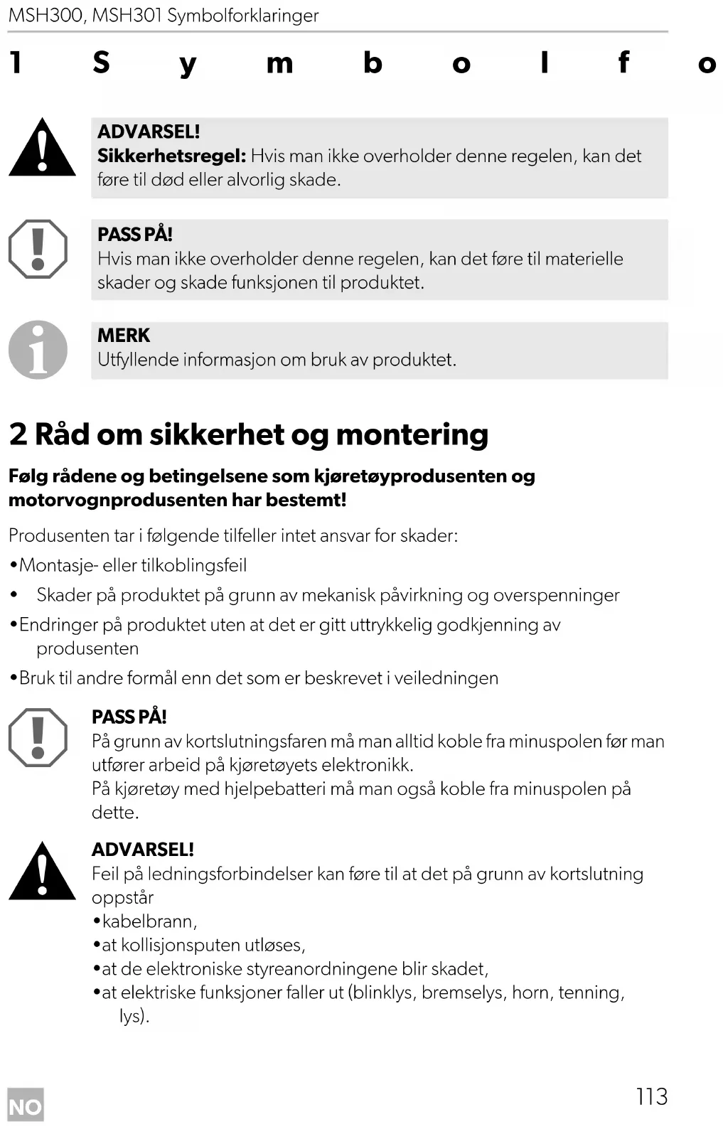 2 Råd om sikkerhet og montering Følg rådene og betingelsene som kjøretøyprodusenten og motorvognprodusenten har bestemt! Produsenten tar i følgende tilfeller intet ansvar for skader: