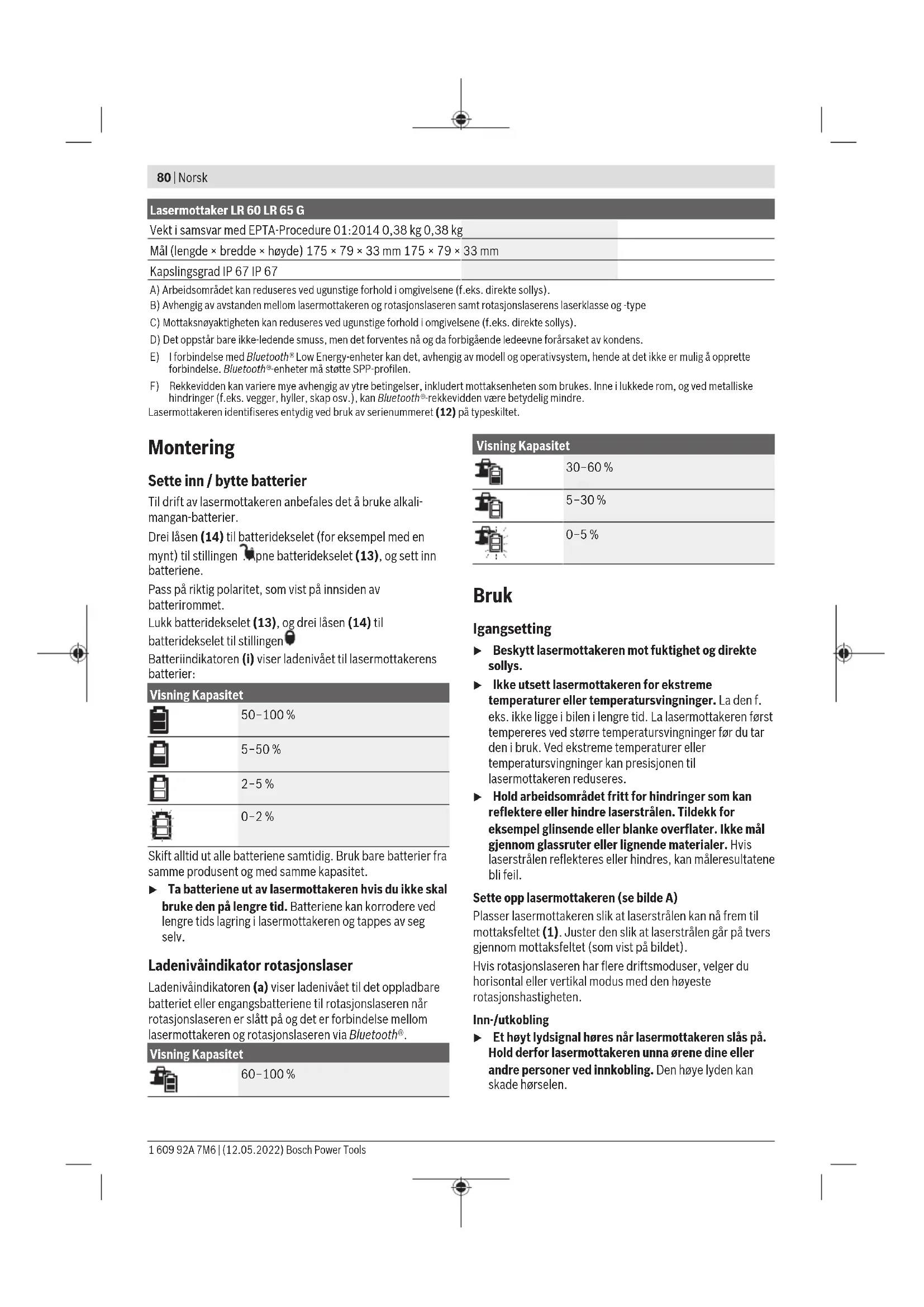 100m 100m – Driftsfrekvensområde 2402–2480MHz 2402–2480MHz – Sendeeffekt maks. 6,3 mW 6,3 mW Batterier 2×1,5V LR6(AA) 2×1,5V LR6(AA) Driftstid ca. 50t 50t Bosch Power Tools 1 609 92A 7M6 | (12.05.2022)80 | Norsk Lasermottaker LR 60 LR 65G Vekt i samsvar med EPTA‑Procedure01:2014 0,38kg 0,38kg Mål (lengde× bredde× høyde) 175×79×33mm 175×79×33mm Kapslingsgrad IP 67 IP 67 A) Arbeidsområdet kan reduseres ved ugunstige forhold i omgivelsene (f.eks. direkte sollys). B) Avhengig av avstanden mellom lasermottakeren og rotasjonslaseren samt rotasjonslaserens laserklasse og -type C) Mottaksnøyaktigheten kan reduseres ved ugunstige forhold i omgivelsene (f.eks. direkte sollys). D) Det oppstår bare ikke-ledende smuss, men det forventes nå og da forbigående ledeevne forårsaket av kondens. E) I forbindelse med Bluetooth® Low Energy-enheter kan det, avhengig av modell og operativsystem, hende at det ikke er mulig å opprette forbindelse. Bluetooth®-enheter må støtte SPP-profilen. F) Rekkevidden kan variere mye avhengig av ytre betingelser, inkludert mottaksenheten som brukes. Inne i lukkede rom, og ved metalliske hindringer (f.eks. vegger, hyller, skap osv.), kan Bluetooth®-rekkevidden være betydelig mindre. Lasermottakeren identifiseres entydig ved bruk av serienummeret (12) på typeskiltet. Montering Sette inn / bytte batterier Til drift av lasermottakeren anbefales det å bruke alkali- mangan-batterier. Drei låsen(14) til batteridekselet (for eksempel med en mynt) til stillingen . Åpne batteridekselet(13), og sett inn batteriene. Pass på riktig polaritet, som vist på innsiden av batterirommet. Lukk batteridekselet(13), og drei låsen(14) til batteridekselet til stillingen . Batteriindikatoren(i) viser ladenivået til lasermottakerens batterier: Visning Kapasitet 50−100% 5−50% 2−5% 0−2% Skift alltid ut alle batteriene samtidig. Bruk bare batterier fra samme produsent og med samme kapasitet. u Ta batteriene ut av lasermottakeren hvis du ikke skal bruke den på lengre tid. Batteriene kan korrodere ved lengre tids lagring i lasermottakeren og tappes av seg selv. Ladenivåindikator rotasjonslaser Ladenivåindikatoren(a) viser ladenivået til det oppladbare batteriet eller engangsbatteriene til rotasjonslaseren når rotasjonslaseren er slått på og det er forbindelse mellom lasermottakeren og rotasjonslaseren via Bluetooth®. Visning Kapasitet 60−100% Visning Kapasitet 30−60% 5−30% 0−5% Bruk Igangsetting u Beskytt lasermottakeren mot fuktighet og direkte sollys. u Ikke utsett lasermottakeren for ekstreme temperaturer eller temperatursvingninger. La den f. eks. ikke ligge i bilen i lengre tid. La lasermottakeren først tempereres ved større temperatursvingninger før du tar den i bruk. Ved ekstreme temperaturer eller temperatursvingninger kan presisjonen til lasermottakeren reduseres. u Hold arbeidsområdet fritt for hindringer som kan reflektere eller hindre laserstrålen. Tildekk for eksempel glinsende eller blanke overflater. Ikke mål gjennom glassruter eller lignende materialer. Hvis laserstrålen reflekteres eller hindres, kan måleresultatene bli feil. Sette opp lasermottakeren (sebildeA) Plasser lasermottakeren slik at laserstrålen kan nå frem til mottaksfeltet(1). Juster den slik at laserstrålen går på tvers gjennom mottaksfeltet (som vist på bildet). Hvis rotasjonslaseren har flere driftsmoduser, velger du horisontal eller vertikal modus med den høyeste rotasjonshastigheten. Inn-/utkobling u Et høyt lydsignal høres når lasermottakeren slås på. Hold derfor lasermottakeren unna ørene dine eller andre personer ved innkobling. Den høye lyden kan skade hørselen. 1 609 92A 7M6 | (12.05.2022) Bosch Power ToolsNorsk | 81 For å slå på lasermottakeren trykker du på av/på-knappen (19). Alle displayvisningene og alle lysdiodene lyser en kort stund, og det høres et lydsignal. For å slå av lasermottakeren holder du av/på-knappen(19) inne helt til alle lysdiodene lyser en kort stund og displayet slukker. Med unntak av innstillingen av displaylysstyrken lagres alle innstillingene når lasermottakeren slås av. Hvis ingen knapp på lasermottakeren trykkes på ca. 10minutter og ingen laserstråle treffer mottaksfeltet(1) på 10minutter, slås lasermottakeren automatisk av, slik at batteriene skånes. Forbindelse med rotasjonslaseren Ved levering er rotasjonslaseren og lasermottakeren som fulgte med, allerede koblet til hverandre via Bluetooth®. Hvis det allerede er opprettet forbindelse, vises dette av ikonet for forbindelse via Bluetooth®(b) på displayet til lasermottakeren. For å koble til lasermottakeren på nytt eller koble en ekstra lasermottaker til rotasjonslaseren, holder du knappen Bluetooth® på rotasjonslaseren inne helt til symbolet for opprettelse av forbindelse med fjernkontroll/lasermottaker vises på displayet til rotasjonslaseren. Hold deretter knappene for X‑akse(16) og Y‑akse(15) på lasermottakeren inntrykt helt til tekstfeltet (e) til lasermottakeren viser P‑‑. Når forbindelsen er opprettet, vises dette på displayet til rotasjonslaseren. I tekstfeltet(e) til lasermottakeren vises POK. Hvis det ikke er mulig å opprette forbindelse mellom rotasjonslaseren og lasermottakeren, visesPNK i tekstfeltet(e) til lasermottakeren, og feilmeldingen om mislykket tilkobling vises på displayet til rotasjonslaseren. Se bruksanvisningen for beskrivelse av hvordan problemet løses. Retningsindikatorer Posisjonen til laserstrålen i mottaksfeltet(1) vises: – på displayet(5) på for- og baksiden av lasermottakeren via retningsindikatoren "Laserstråle under senterlinje"(f), retningsindikatoren "Lasertråle over senterlinje"(j) eller indikatoren for senterlinje(h), – eventuelt av den røde LED-retningsindikatoren "Lasertråle under senterlinje"(4), den blå LED- retningsindikatoren "Laserstråle over senterlinje"(2) og den grønne LED-en for senterlinje(3) på forsiden av lasermottakeren, – eventuelt med lydsignal