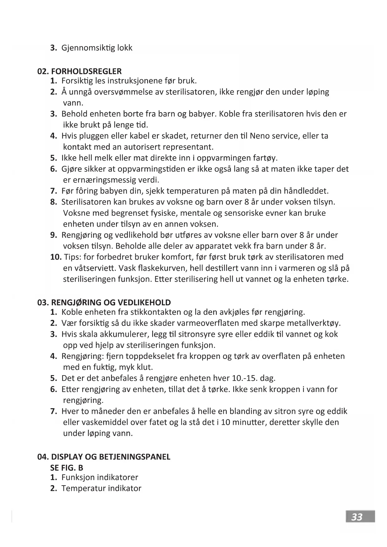 mat eller sterilisere funksjoner. a. Rask oppvarming: Se kurven inn i sterilisatoren, hell i 40 ml desllert vann og se inn fôringen aske og se på lokket. Trykk på „Modus” knappen l „Fast” lyser opp og skjermen viser en temperatur på 37°C. I dee modus du kan see en d mellom 1 og 8 minuer, som du kan gjøre ved å bruke det lsvarende knapper. Ordet „Rask” vil lys opp 2 ganger, apparatet vil lag en lyd og start oppvarmingen. Under oppvar- ming, skjermen vil vise gjenværende oppvarmingsd og vises temperatur på 37 ° C er målasken temperatur. Sjekk diagrammet som følger med produktet eller SE FIG.C for å justere den i henhold l mengden mat som skal varmes opp. Når den raske oppvarmingen er ferdig, maskinen vil pipe 5 ganger og vil automask slå på 24- mers „Melk” modus, for å oppreholde temperaturen på den oppvarmede maten, legg l desllert vann l 160 ml (MAX) linjen. Hvis apparatet starter jobber uten vann den vil automask slå av og kan kun brukes en gang l en gang den har avkjølt l rom temperatur, altså forlenge leveden l apparatet. Sjekk tempera- turen på den varme maten før fôring det l babyen din. b. Bord beskrivelse SE FIG. C C.1 Anbefalt d for hurgoppvarmingsmodus | C.2 Flaske materiale | C.3 Plast | C.4 Glass | C.5 Innledende temperatur | C.6 Mat MERK: Faksk d kan variere på grunn av aske materiale, aske vegg tykkelse, omgivende temperatur, innledende maemperatur, aske temperatur, vann temperatur, mengde mat. Før fôring, lage sikker på at maten er det på sikker temperatur å gi baby- en din. Hvis maten ikke er varm nok, plasser asken lbake i varmeren i 0,5-1 minuer. c. Oppvarming/ ning: se kurven inn i sterilisatoren, hell i 160 ml desllert vann og se inn fôringen aske og se på lokket. Trykk på „Modus” knappen l „Melk” lyser opp og skjermen viser den dligere innslte temperaturen mellom 35°C og 60°C og standard d på 24 mer. I dee35 modus du kan slle inn temperaturen mellom 35°C og 60°C ved bruk av lsvarende knapper. Ordet „melk” vil lys opp 2 ganger, enheten vil lag en lyd og start oppvarmingen. Under oppvarming viser displayet strøm- men vann temperatur og den på 24 mer vil bli erstaet av blinking rektangulær lys. Enheten vil pipe 5 ganger for å indikere når den innslte temperaturen har vært nådd og dereer når den har vært ferdig. De 24 mene er regnet fra vannet er varmes opp l innslt temperatur. d. Mat: bruk dee modus for å varme halvytende matvarer og opprehol- de temperaturen i oppl 2 mer. Se kurven inn i sterilisatoren, hell i 160 ml desllert vann og se dereer inn malasken og se på lokket. Trykk på „Modus” knappen l „Mat” lyser opp og skjermen viser den dligere innslte temperaturen mellom 30°C og 80°C og standard d på 2 mer. Maskinen vil pipe fem ganger for å informere du at den er ferdig. e. Sterilisering: Bruk dee modus for å sterilisere asker og spener. Plasser kurven i sterilisatoren, hell i 40 ml desllert vann og se dereer inn asken og/eller spene og se på lokket. Trykk på „Modus” knappen l „Steam” lyser opp og skjermen viser en temperatur på 100°C. „Steam” vil lys opp 2 ganger, enheten vil avgir en lyd og begynner å varmes opp. Det faste dspunktet for dee funksjon er 10 minuer. I dee modus, temperatur og d kan ikke endres. Enheten vil pipe 5 ganger for å informere du at den er ferdig. f. Start standard på ny innsllinger: hold nede „Øk d/temperatur” knappen på enhetens sove modus for å gjenoppree enheten l fabrikk innsllinger. OBS: Bruk vann annen enn desllert vann årsaker skala og sediment akkumulering og forkorter enhetens leved. Produsenten anbefaler bruk av desllert vann.