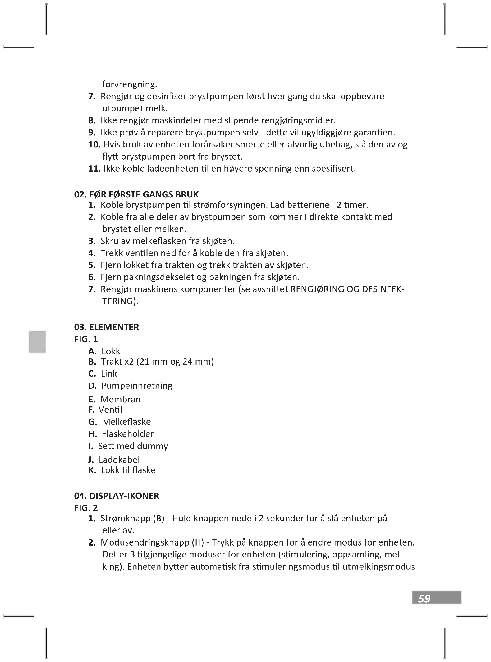 Rådene: a. Kontroller brystpumpens deler for skader før hver bruk. By om nødvendig ut skadede deler med nye. b. Kontroller alld at komponentene er rene før du bruker enheten. c. For å unngå å skade brystpumpen, sørg for at alle delene er tørre før bruk.
