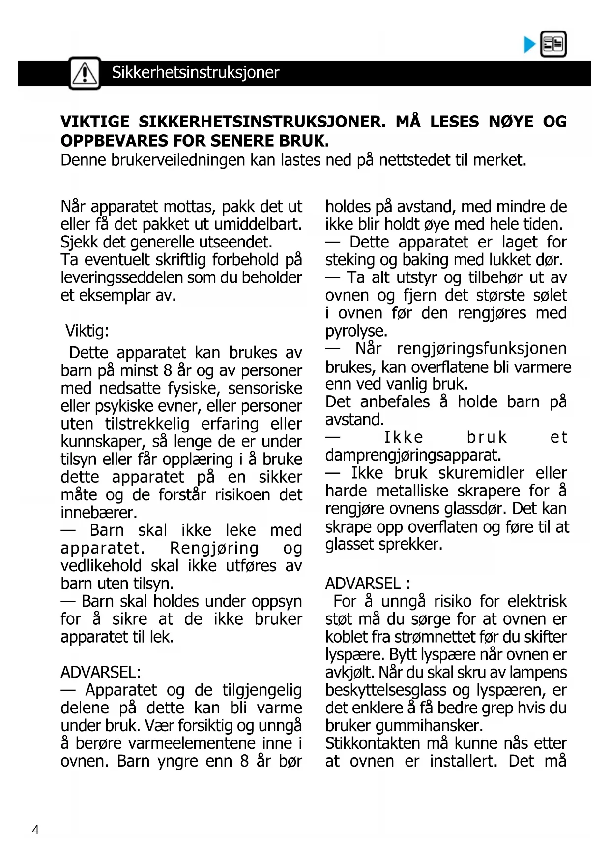 - Funksjoner med automatisk kombinert damp Sikkerhetsinstruksjoner Når apparatet mottas, pakk det ut eller få det pakket ut umiddelbart. Sjekk det generelle utseendet. Ta eventuelt skriftlig forbehold på leveringsseddelen som du beholder et eksemplar av. Viktig: Dette apparatet kan brukes av barn på minst 8 år og av personer med nedsatte fysiske, sensoriske eller psykiske evner, eller personer uten tilstrekkelig erfaring eller kunnskaper, så lenge de er under tilsyn eller får opplæring i å bruke dette apparatet på en sikker måte og de forstår risikoen det innebærer. — Barn skal ikke leke med apparatet. Rengjøring og vedlikehold skal ikke utføres av barn uten tilsyn. — Barn skal holdes under oppsyn for å sikre at de ikke bruker apparatet til lek. ADVARSEL: — Apparatet og de tilgjengelig delene på dette kan bli varme under bruk. Vær forsiktig og unngå å berøre varmeelementene inne i ovnen. Barn yngre enn 8 år bør holdes på avstand, med mindre de ikke blir holdt øye med hele tiden. — Dette apparatet er laget for steking og baking med lukket dør. — Ta alt utstyr og tilbehør ut av ovnen og fjern det største sølet i ovnen før den rengjøres med pyrolyse. — Når rengjøringsfunksjonen brukes, kan overatene bli varmere enn ved vanlig bruk. Det anbefales å holde barn på avstand. — Ikke bruk et damprengjøringsapparat. — Ikke bruk skuremidler eller harde metalliske skrapere for å rengjøre ovnens glassdør. Det kan skrape opp overaten og føre til at glasset sprekker. ADVARSEL : For å unngå risiko for elektrisk støt må du sørge for at ovnen er koblet fra strømnettet før du skifter lyspære. Bytt lyspære når ovnen er avkjølt. Når du skal skru av lampens beskyttelsesglass og lyspæren, er det enklere å få bedre grep hvis du bruker gummihansker. Stikkontakten må kunne nås etter at ovnen er installert. Det må VIKTIGE SIKKERHETSINSTRUKSJONER. MÅ LESES NØYE OG OPPBEVARES FOR SENERE BRUK. Denne brukerveiledningen kan lastes ned på nettstedet til merket.5 Sikkerhetsinstruksjoner Sikkerhetsinstruksjoner være mulig å frakoble apparatet fra strømnettet, enten ved hjelp av støpselet, eller ved å installere en bryter på de faststående rørene i samsvar med installasjonsreglene. — Hvis strømledningen er skadet, må den av sikkerhetsmessige årsaker erstattes av produsenten, dens kundeservice eller av en person med lignende kvalikasjoner. — Dette apparatet kan installeres både under arbeidsbenken eller i et høyskap som forklart på installasjonstegningen. — Sett ovnen i innredningen slik at det er minst 10 mm avstand mellom ovnen og skapet ved siden av. Innredningen som ovnen skal bygges inn i, må tåle høye temperaturer eller være belagt med et materiale som tåler høye temperaturer. For at ovnen skal bli så stabil som mulig, bør du montere den fast i innredningen med to skruer som skrus inn i hullene på sidestolpene. — For å unngå overoppheting skal apparatet ikke installeres bak en pyntedør. — Dette apparatet er beregnet til bruk i hjemmet og lignende ste- der, f.eks. i et kjøkken forbeholdt personalet i butikker, på kontorer og andre arbeidsplasser, på gårds- bruk, eller tilgjengelig for kunder på hotell, motell og andre steder med hjemlig preg, eller på rom av typen bed & breakfast. — Ovnen skal alltid slås av før den rengjøres innvendig. Dette apparatets karakteristikker må av sikkerhetsmessige hensyn ikke endres. Ikke bruk ovnen til oppbevaring av matvarer eller annet utstyr etter bruk.Installasjon p. 264