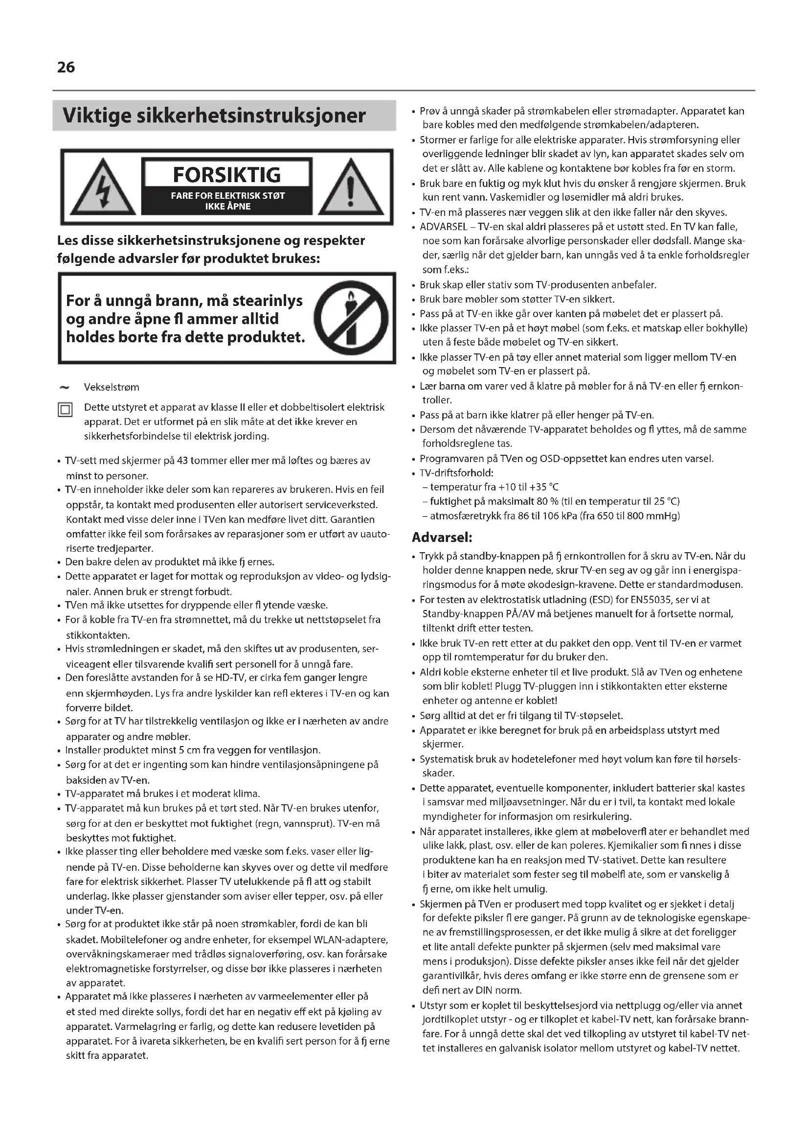 Les disse sikkerhetsinstruksjonene og respekter følgende advarsler før produktet brukes: For å unngå brann, må stearinlys og andre åpne ammer alltid holdes borte fra dette produktet. Vekselstrøm Dette utstyret et apparat av klasse II eller et dobbeltisolert elektrisk apparat. Det er utformet på en slik måte at det ikke krever en sikkerhetsforbindelse til elektrisk jording.