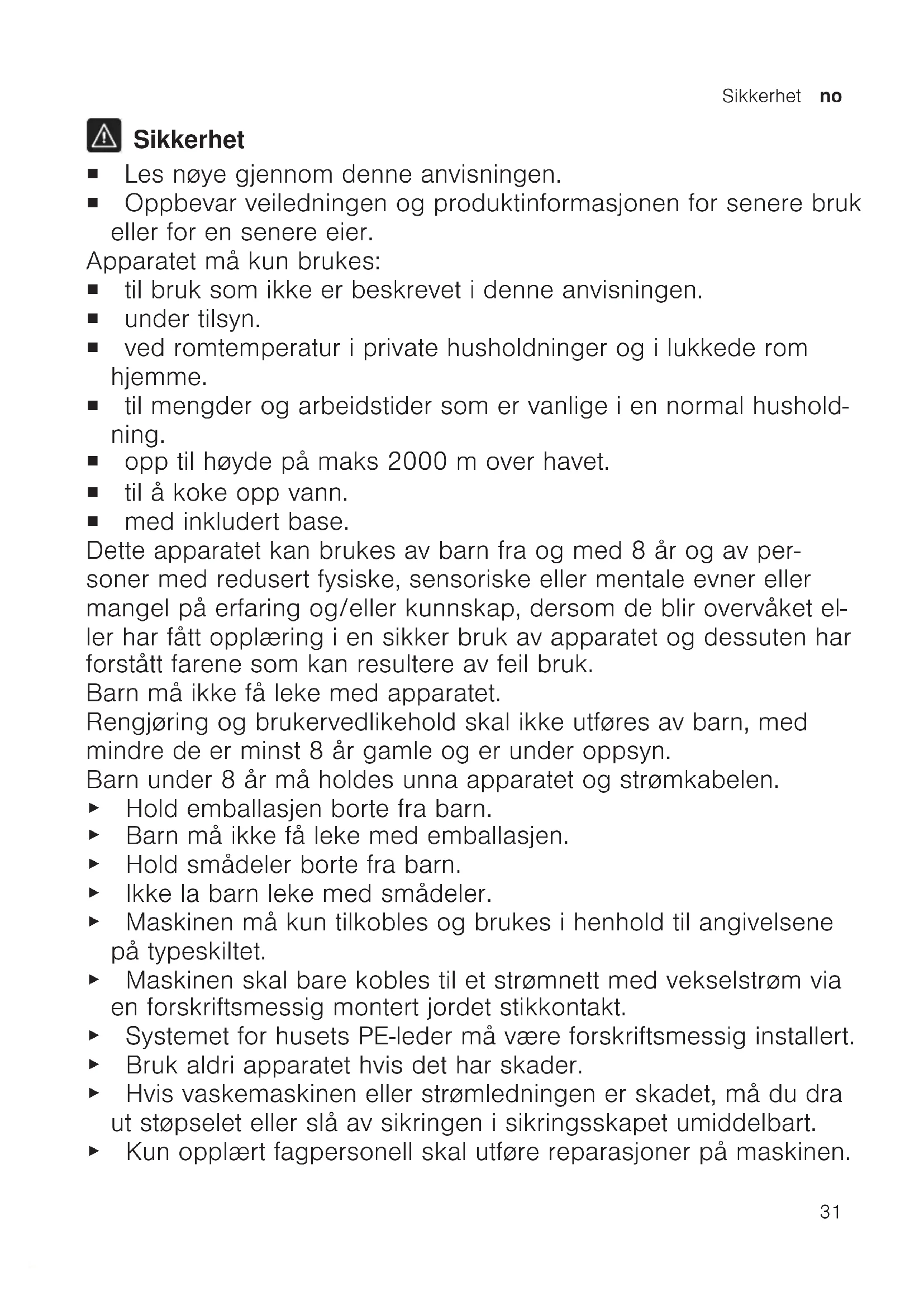 Sikkerhet ¡ Les nøye gjennom denne anvisningen. ¡ Oppbevar veiledningen og produktinformasjonen for senere bruk eller for en senere eier. Apparatet må kun brukes: ¡ til bruk som ikke er beskrevet i denne anvisningen. ¡ under tilsyn. ¡ ved romtemperatur i private husholdninger og i lukkede rom hjemme. ¡ til mengder og arbeidstider som er vanlige i en normal hushold- ning. ¡ opp til høyde på maks 2000m over havet. ¡ til å koke opp vann. ¡ med inkludert base. Dette apparatet kan brukes av barn fra og med 8 år og av per- soner med redusert fysiske, sensoriske eller mentale evner eller mangel på erfaring og/eller kunnskap, dersom de blir overvåket el- ler har fått opplæring i en sikker bruk av apparatet og dessuten har forstått farene som kan resultere av feil bruk. Barn må ikke få leke med apparatet. Rengjøring og brukervedlikehold skal ikke utføres av barn, med mindre de er minst 8 år gamle og er under oppsyn. Barn under 8 år må holdes unna apparatet og strømkabelen. ▶ Hold emballasjen borte fra barn. ▶ Barn må ikke få leke med emballasjen. ▶ Hold smådeler borte fra barn. ▶ Ikke la barn leke med smådeler. ▶ Maskinen må kun tilkobles og brukes i henhold til angivelsene på typeskiltet. ▶ Maskinen skal bare kobles til et strømnett med vekselstrøm via en forskriftsmessig montert jordet stikkontakt. ▶ Systemet forhusets PE-leder må væreforskriftsmessig installert. ▶ Bruk aldri apparatet hvis det har skader. ▶ Hvis vaskemaskinen eller strømledningen er skadet, må du dra ut støpselet eller slå av sikringen i sikringsskapet umiddelbart. ▶ Kun opplært fagpersonell skal utføre reparasjoner på maskinen.no Unngå materielle skader