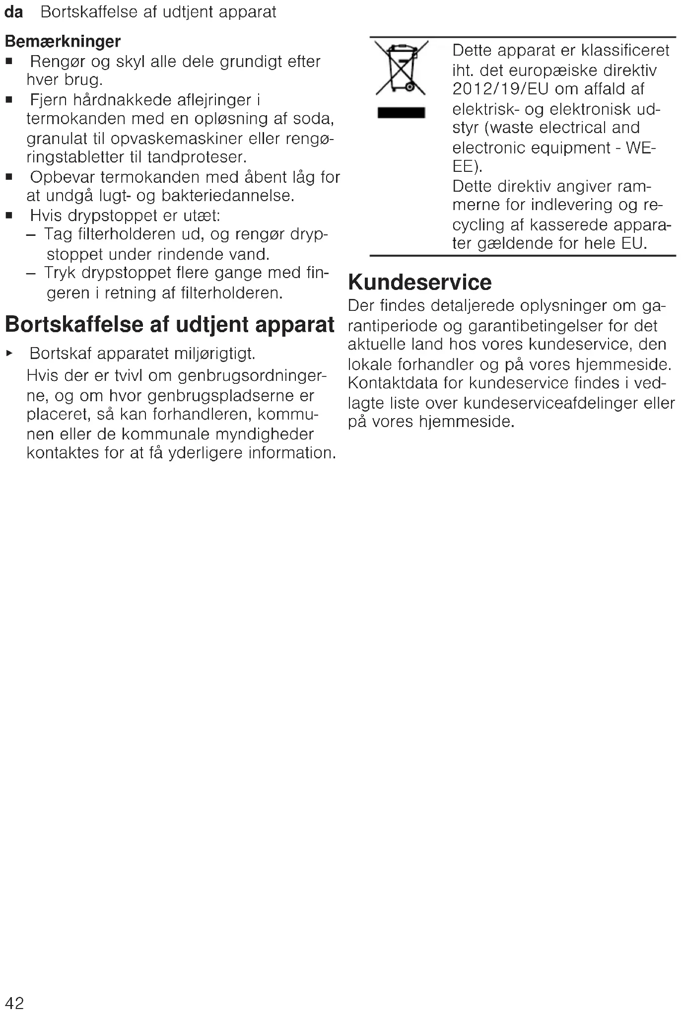- Fig. 28 Merknader ¡ Rengjør og skyll alle deler grundig etter hver bruk. ¡ Hårdnakkede avleiringer i termokannen kan fjernes med en løsning av soda, gra- nulat for oppvaskmaskin eller rengjø- ringstabletter for gebiss. ¡ Oppbevar termokannen med åpent lokk for å unngå at det dannes lukt og bak- terier. ¡ Hvis dryppstopp er utett: – Ta ut filterholderen og rengjør drypp- stopp under rennende vann. – Trykk dryppstopp gjentatte ganger med fingeren i retning filterholderen. Avfallsbehandling av gammelt apparat ▶ Kast apparatet på en miljøvennlig måte. Du kan innhente informasjon om aktuelle muligheter for avfallsbehandling hos en spesialisert forhandler eller hos kom- muneadministrasjonen der du bor. Dette apparatet er klassifi- sert i henhold til det europe- iske direktivet 2012/19/EU om avhending av elektrisk- og elektronisk utstyr (waste electrical and electronic equipment – WEEE). Direktivet angir rammene for innlevering og gjenvinning av innbytteprodukter. Kundeservice Du får detaljert informasjon om garantitid og garantivilkår i ditt land hos vår kundeservice, din forhandler eller på våre nettsider. Kontaktinformasjonen for kundeservice fin- ner du i den vedlagte kundeserviceoversik- ten eller på våre nettsider.sv Säkerhet
