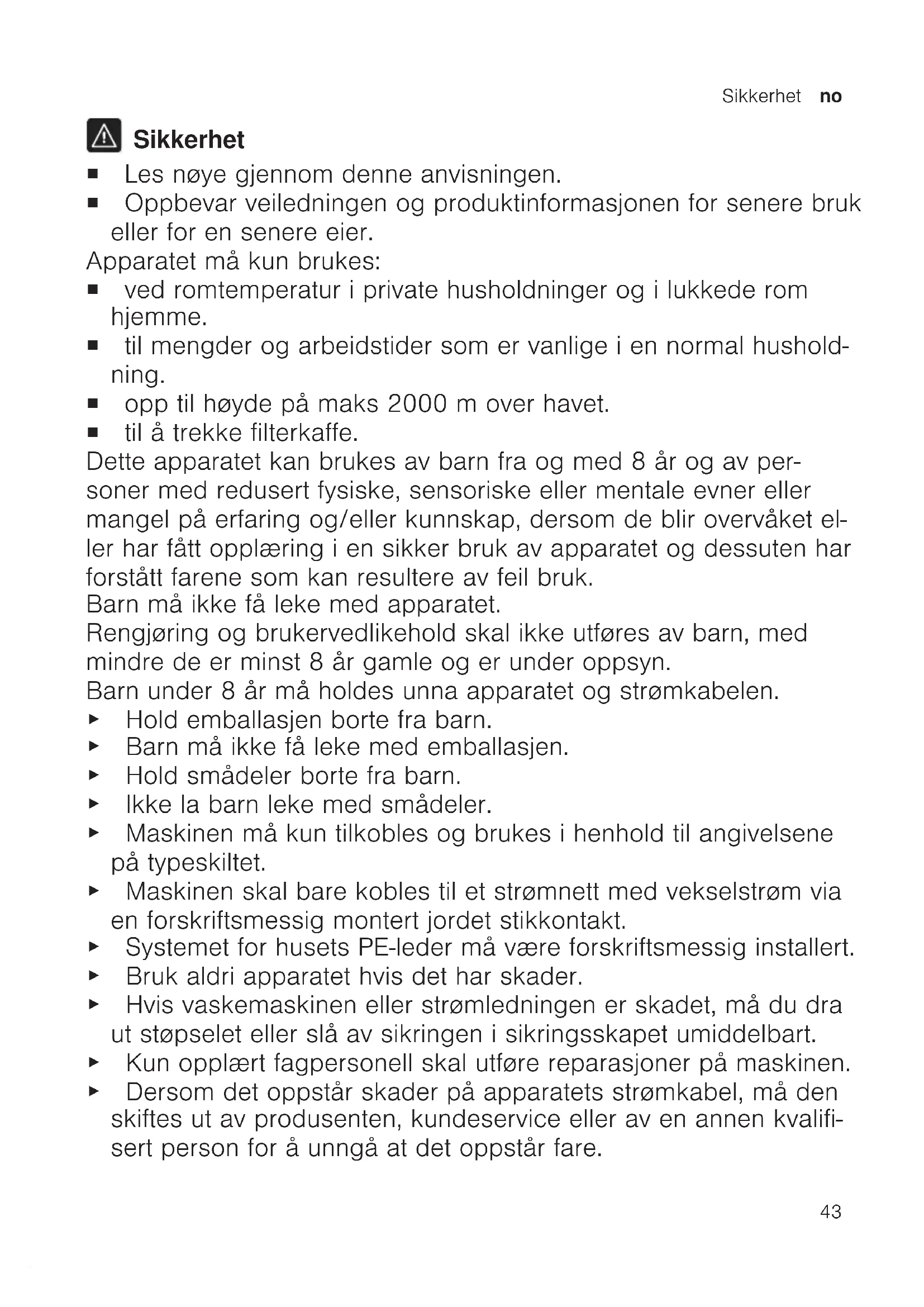 Sikkerhet ¡ Les nøye gjennom denne anvisningen. ¡ Oppbevar veiledningen og produktinformasjonen for senere bruk eller for en senere eier. Apparatet må kun brukes: ¡ ved romtemperatur i private husholdninger og i lukkede rom hjemme. ¡ til mengder og arbeidstider som er vanlige i en normal hushold- ning. ¡ opp til høyde på maks 2000m over havet. ¡ til å trekke filterkaffe. Dette apparatet kan brukes av barn fra og med 8 år og av per- soner med redusert fysiske, sensoriske eller mentale evner eller mangel på erfaring og/eller kunnskap, dersom de blir overvåket el- ler har fått opplæring i en sikker bruk av apparatet og dessuten har forstått farene som kan resultere av feil bruk. Barn må ikke få leke med apparatet. Rengjøring og brukervedlikehold skal ikke utføres av barn, med mindre de er minst 8 år gamle og er under oppsyn. Barn under 8 år må holdes unna apparatet og strømkabelen. ▶ Hold emballasjen borte fra barn. ▶ Barn må ikke få leke med emballasjen. ▶ Hold smådeler borte fra barn. ▶ Ikke la barn leke med smådeler. ▶ Maskinen må kun tilkobles og brukes i henhold til angivelsene på typeskiltet. ▶ Maskinen skal bare kobles til et strømnett med vekselstrøm via en forskriftsmessig montert jordet stikkontakt. ▶ Systemet forhusets PE-leder må væreforskriftsmessig installert. ▶ Bruk aldri apparatet hvis det har skader. ▶ Hvis vaskemaskinen eller strømledningen er skadet, må du dra ut støpselet eller slå av sikringen i sikringsskapet umiddelbart. ▶ Kun opplært fagpersonell skal utføre reparasjoner på maskinen. ▶ Dersom det oppstår skader på apparatets strømkabel, må den skiftes ut av produsenten, kundeservice eller av en annen kvalifi- sert person for å unngå at det oppstår fare.no Unngå materielle skader