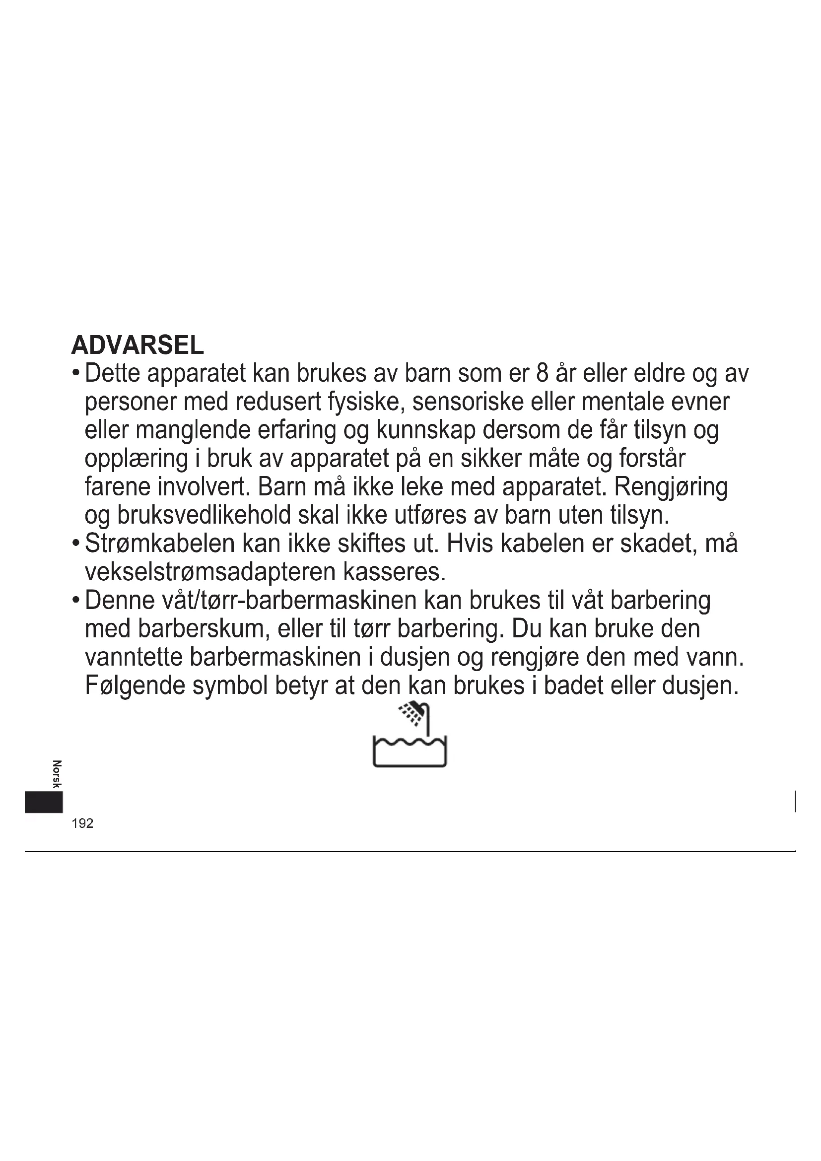Denne våt/tørr‑barbermaskinen kan brukes til våt barbering med barberskum, eller til tørr barbering. Du kan bruke den vanntette barbermaskinen i dusjen og rengjøre den med vann. Følgende symbol betyr at den kan brukes i badet eller dusjen.193 Norsk