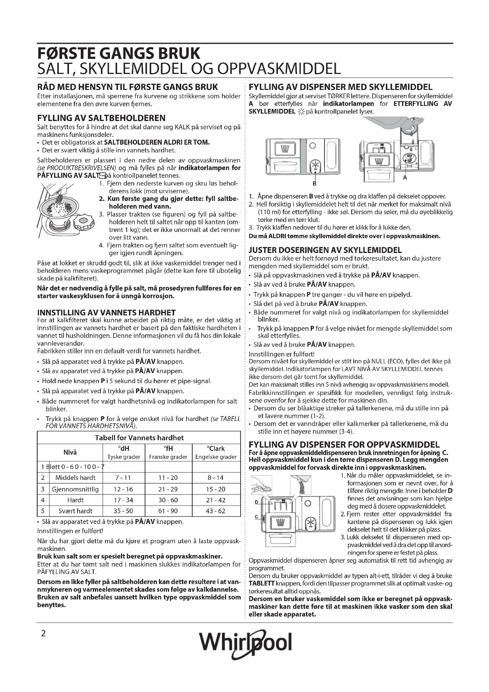 - Trykk på knappen P for å velge ønsket nivå for hardhet (se TABELL FOR VANNETS HARDHETSNIVÅ).• Slå av apparatet ved å trykke på PÅ/AV knappen.Innstillingen er fullført!Når du har gjort dette må du kjøre et program uten å laste oppvask-maskinen.Bruk kun salt som er spesielt beregnet på oppvaskmaskiner.Etter at du har tømt salt ned i maskinen slukkes indikatorlampen for PÅFYLLING AV SALT.Dersom en ikke fyller på saltbeholderen kan dette resultere i at van-nmykneren og varmeelementet skades som følge av kalkdannelse.Bruken av salt anbefales uansett hvilken type oppvaskmiddel som benyttes.