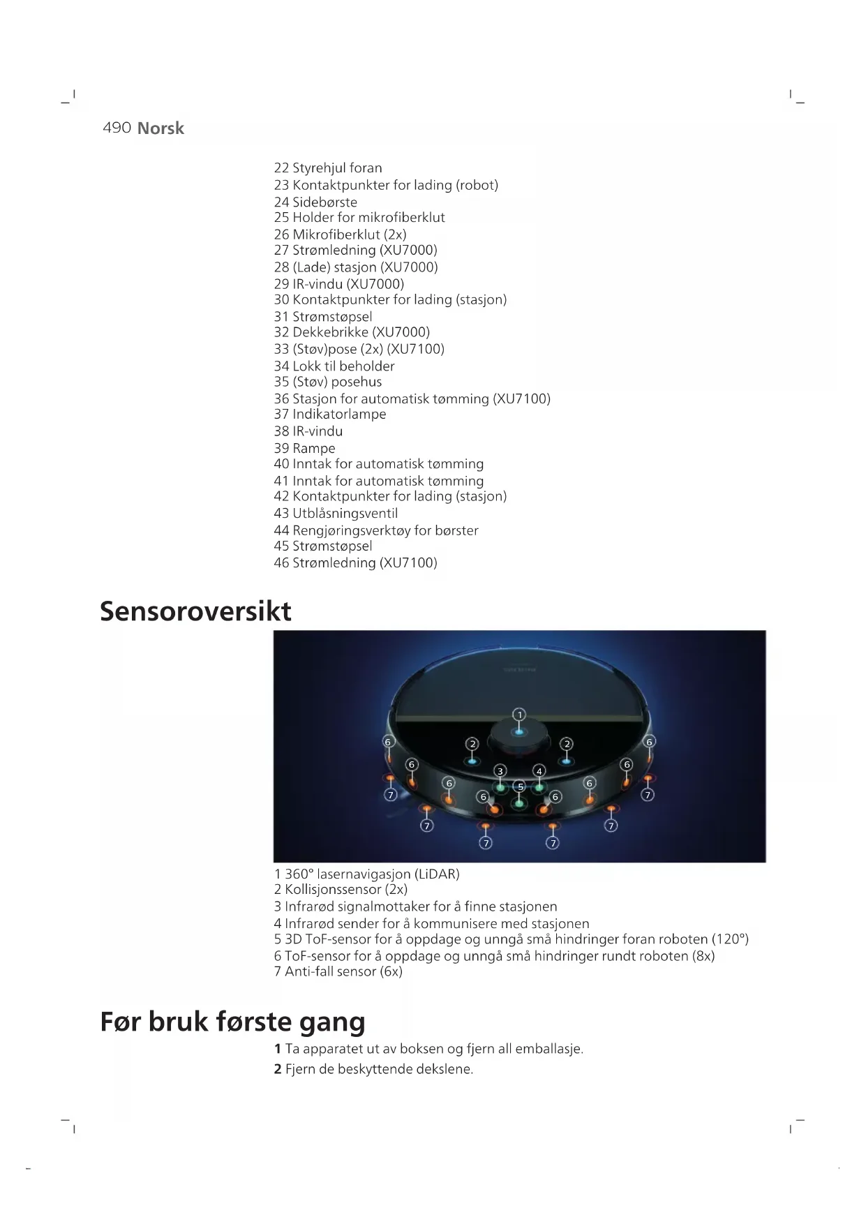 Etter at den er ferdig med rengjøringen, vil roboten automatisk kjøre tilbake til stasjonen for å lade opp. Merk: Når roboten er docket inn, drar den strøm for å bevare optimal batteriytelse. Energiforbruket vil imidlertid være begrenset. Merk: Bare for modell XU7100 vil stasjonen også støvsuge støvbeholderen til roboten tom. Støvet samles deretter opp i stasjonens støvpose.504 Norsk Lad opp på nytt og gjenoppta automatisk Når batteriet blir lavt (<20 %) under rengjøring, vender roboten automatisk tilbake til stasjonen for å lades opp. Etter at batteriet er ladet opp, fortsetter roboten der den slapp. Rengjøring og vedlikehold Når det trengs vedlikehold Artikkel Rengjøring Utskiftning Vaskbar mikrofiberklut Etter hver bruk 3–6 måneder Hovedbørste Månedlig 6–12 måneder Vaskbart filter Månedlig 3–6 måneder Sidebørste Månedlig 6–12 måneder Hovedhjul og universalhjul Månedlig - 360° lasernavigasjon (LiDAR)-sensor Månedlig - Sensorer: - Kollisjonssensor (2x) - Infrarød signalmottaker for å finne stasjonen - Infrarød sender for å kommunisere med stasjonen - 3D ToF-sensor for å oppdage og unngå små hindringer foran roboten (120°) - ToF-sensor for å oppdage og unngå små hindringer rundt roboten (8x) - Anti-fall sensor (6x) Månedlig - Ladekontakter på roboten og stasjonen Månedlig -505 Norsk Sensorer som registrerer plasseringen av støv- og vannbeholderen 6 måneder - Støvbeholder (XU7000) Tøm støvbeholderen etter hver bruk