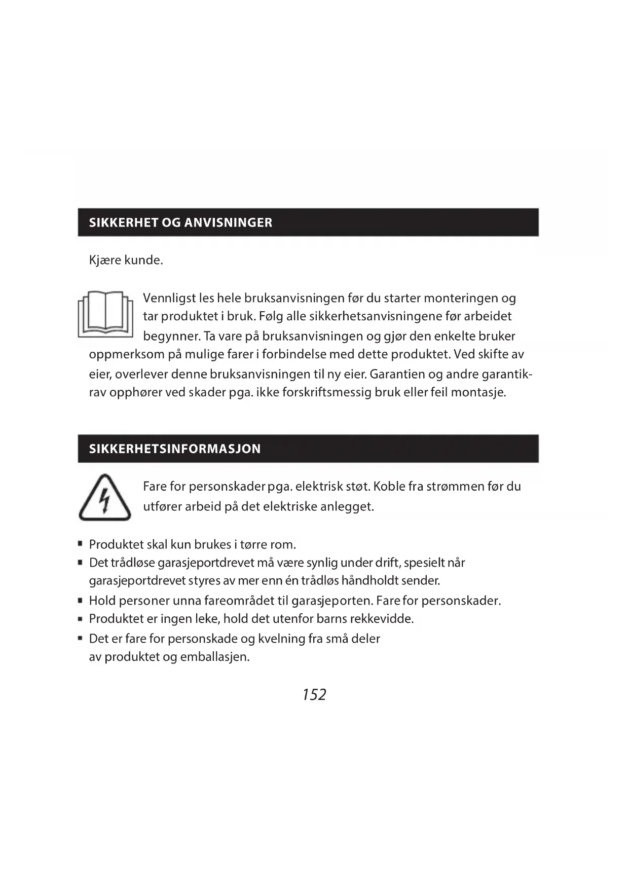 Kjære kunde Vennligst les hele bruksanvisningen før du starter monteringen og tar produktet i bruk Følg alle sikkerhetsanvisningene før arbeidet begynner Ta vare på bruksanvisningen og gjør den enkelte bruker oppmerksom på mulige farer i forbindelse med dette produktet Ved skifte av eier, overlever denne bruksanvisningen til ny eier Garantien og andre garantik- rav opphører ved skader pga ikke forskriftsmessig bruk eller feil montasje SIKKERHETSINFORMASJON Fare for personskader pga elektrisk støt Koble fra strømmen før du utfører arbeid på det elektriske anlegget Produktet skal kun brukes i tørre rom Det trådløse garasjeportdrevet må være synlig under drift, spesielt når garasjeportdrevet styres av mer enn én trådløs håndholdt sender Hold personer unna fareområdet til garasjeporten Fare for personskader Produktet er ingen leke, hold det utenfor barns rekkevidde Det er fare for personskade og kvelning fra små deler av produktet og emballasjen