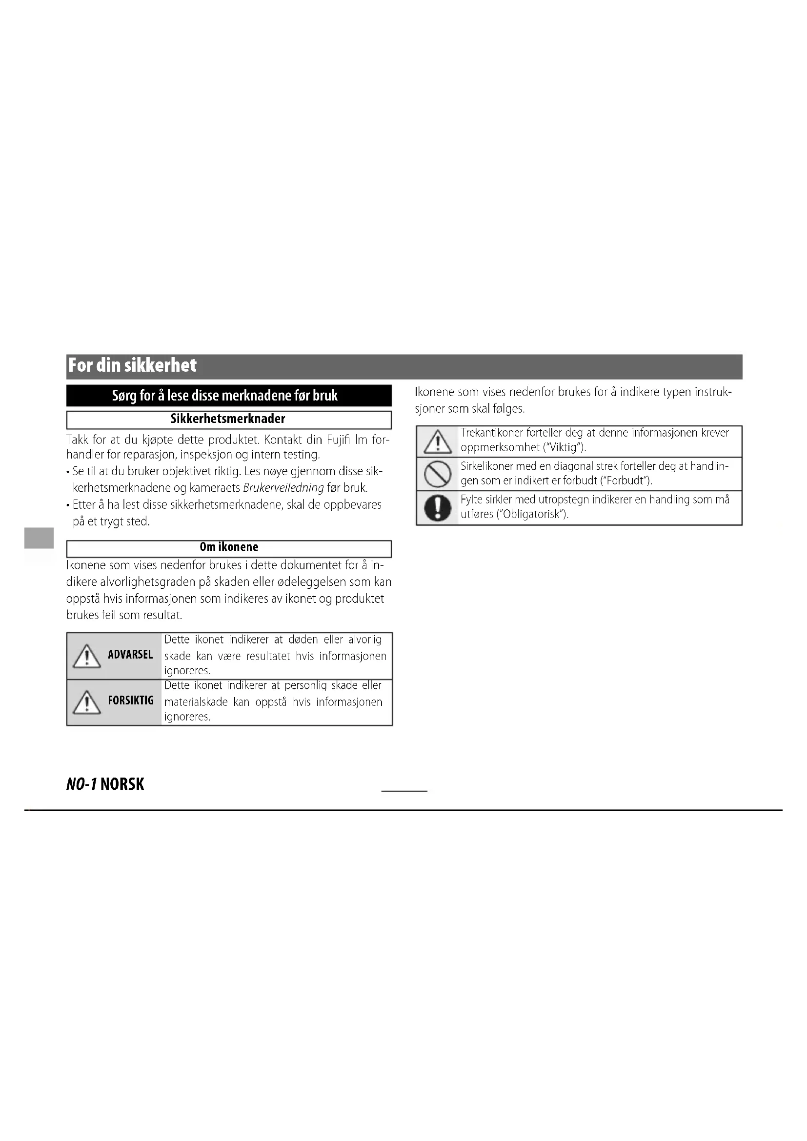 - Etter å ha lest disse sikkerhetsmerknadene, skal de oppbevares på et trygt sted. Om ikonene Ikonene som vises nedenfor brukes i dette dokumentet for å in- dikere alvorlighetsgraden på skaden eller ødeleggelsen som kan oppstå hvis informasjonen som indikeres av ikonet og produktet brukes feil som resultat. ADVARSELDette ikonet indikerer at døden eller alvorlig skade kan være resultatet hvis informasjonen ignoreres.FORSIKTIGDette ikonet indikerer at personlig skade eller materialskade kan oppstå hvis informasjonen ignoreres. Ikonene som vises nedenfor brukes for å indikere typen instruk- sjoner som skal følges. Trekantikoner forteller deg at denne informasjonen krever oppmerksomhet (“Viktig”).Sirkelikoner med en diagonal strek forteller deg at handlin-gen som er indikert er forbudt (“Forbudt”).Fylte sirkler med utropstegn indikerer en handling som må utføres (“Obligatorisk”).NO-2NORSK