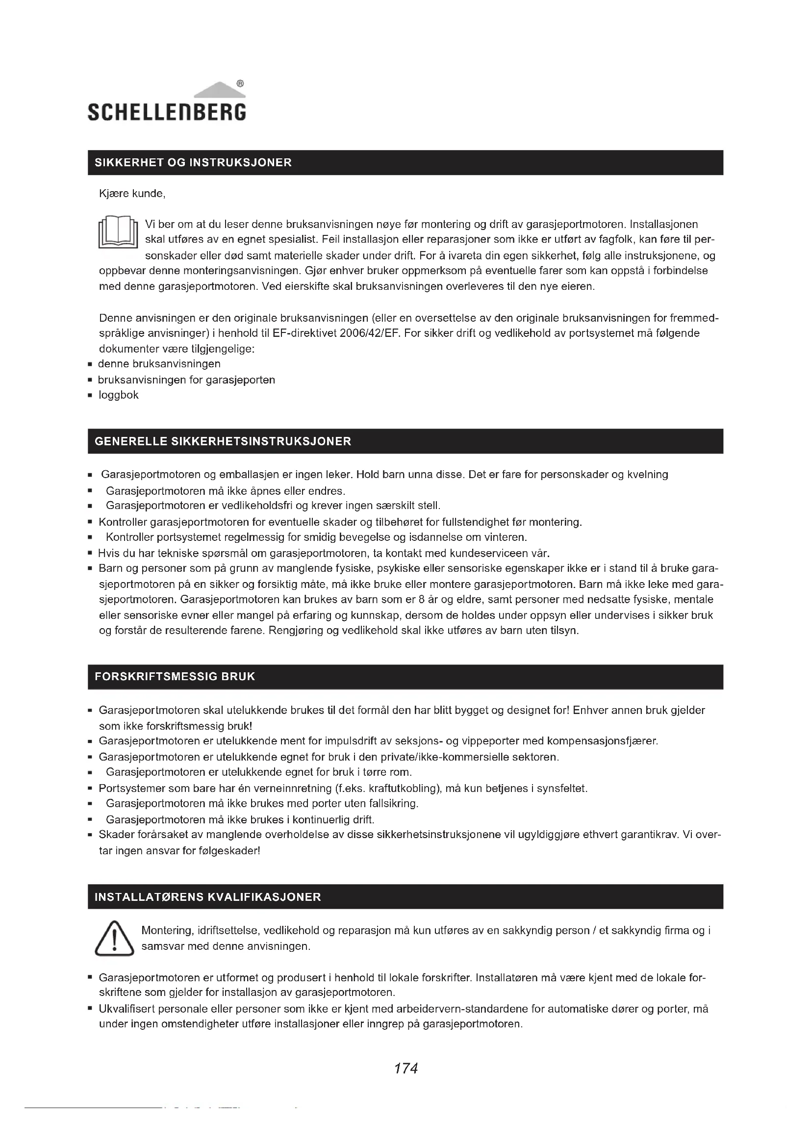 Montering, idriftsettelse, vedlikehold og reparasjon må kun utføres av en sakkyndig person / et sakkyndig rma og i samsvar med denne anvisningen Garasjeportmotoren er utformet og produsert i henhold til lokale forskrifter. Installatøren må være kjent med de lokale for- skriftene som gjelder for installasjon av garasjeportmotoren Ukvalisert personale eller personer som ikke er kjent med arbeidervern-standardene for automatiske dører og porter, må under ingen omstendigheter utføre installasjoner eller inngrep på garasjeportmotoren.174 175