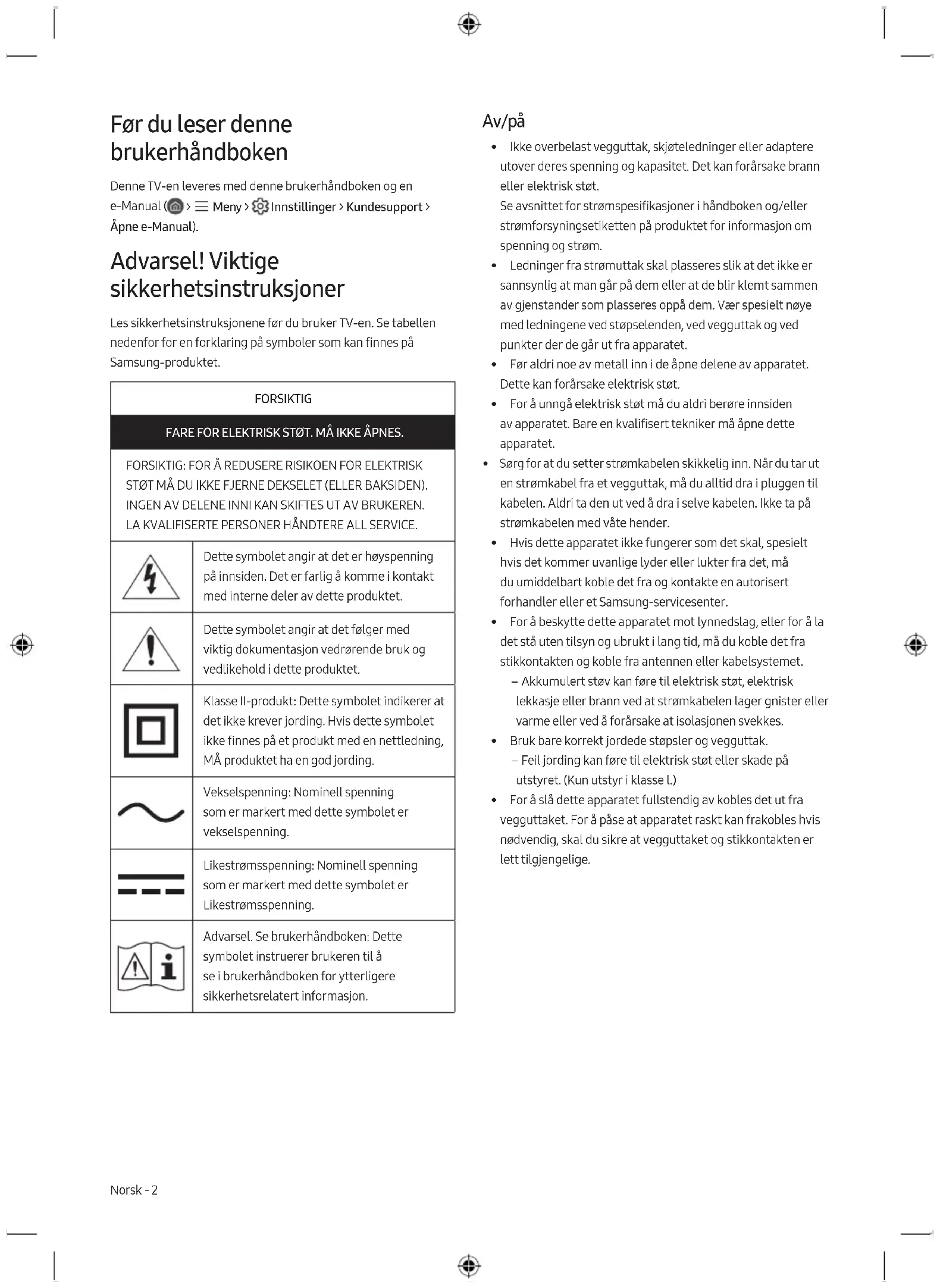 - Figurene og illustrasjonene i denne brukerveiledningen er bare til referanse og kan avvike fra det faktiske produktutseendet. Produktdesign og -spesifikasjoner kan endres uten forvarsel. Du kan bli belastet for et administrasjonsgebyr i følgende tilfeller: (a) En tekniker blir kalt ut på din forespørsel, men det blir ikke funnet noen feil med produktet (dvs. der du ikke har lest denne brukerveiledningen godt nok). (b) Du leverer enheten til Samsung-servicesenteret, men det blir ikke funnet noen feil med produktet (dvs. der du ikke har lest denne brukerveiledningen godt nok). Du vil bli informert om administrasjonsgebyret før du får en tekniker på besøk. Etter reparasjon av en ikke-autorisert tjenesteleverandør, selvreparasjon eller ikke-profesjonell reparasjon av produktet, er Samsung ikke ansvarlig for skade på produktet personskade eller andre produktsikkerhetsproblemer forårsaket av ethvert forsøk på å reparere produktet som ikke følger disse reparasjons- og vedlikeholdsinstruksjonene nøye. Eventuelle skader på produktet forårsaket av et forsøk på å reparere produktet av andre personer enn en Samsung-sertifisert tjenesteleverandør vil ikke dekkes av garantien. Besøk samsung.com/support for å finne ytterligere informasjon om ekstern strømadapter og fjernkontroll tilknyttet EUs Ecodesign-direktiv - ErP-regulering Norsk - 8Korrekt avhending av dette produktet (Avfall fra elektrisk og elektronisk utstyr) (Gjelder i land med avfallssortering) Denne merkingen som vises på produktet, dets tilbehør eller dokumentasjon, indikerer at produktet eller det elektroniske tilbehøret (for eksempel lader, headset, USB-kabel) ikke skal kastes sammen med annet husholdningsavfall ved slutten av levetiden. For å hindre potensiell skade på miljøet eller helseskader grunnet ukontrollert avfallsavhending ber vi om at dette avfallet holdes adskilt fra andre typer avfall og resirkuleres på ansvarlig måte for å fremme bærekraftig gjenbruk av materielle ressurser. Private forbrukere bør kontakte enten forhandleren de kjøpte produktet av, eller lokale myndigheter for detaljer om hvor og hvordan disse artiklene kan resirkuleres på en miljøvennlig måte. Forretningsbrukere bør kontakte sin leverandør og undersøke vilkårene i kjøpskontrakten. Dette produktet og det elektroniske tilbehøret skal ikke blandes med annet kommersielt avfall som skal kastes. Korrekt avhending av batterier i dette produktet (Gjelder i land med avfallssortering) Merkingen på batteriet, håndboken eller emballasjen indikerer at batteriet i dette produktet ikke må kastes med annet husholdningsavfall. Der det er merket, angir de kjemiske symbolene Hg, Cd eller Pb at batteriet inneholder kvikksølv, kadmium eller bly over referansenivåene i EF-direktiv 2006/66. Batteriet i dette produktet kan ikke skiftes ut av brukeren. Hvis du vil ha informasjon om utskifting av batteriet, ber vi deg ta kontakt med forhandleren. Ikke forsøk å fjerne batteriet eller kaste det i ild. Ikke demonter, klem eller stikk hull på batteriet. Hvis du har tenkt å kaste produktet, sørger avfallshåndteringsstedet for riktig resirkulering og behandling av produktet, inkludert batteriet. Ta ut batteriet