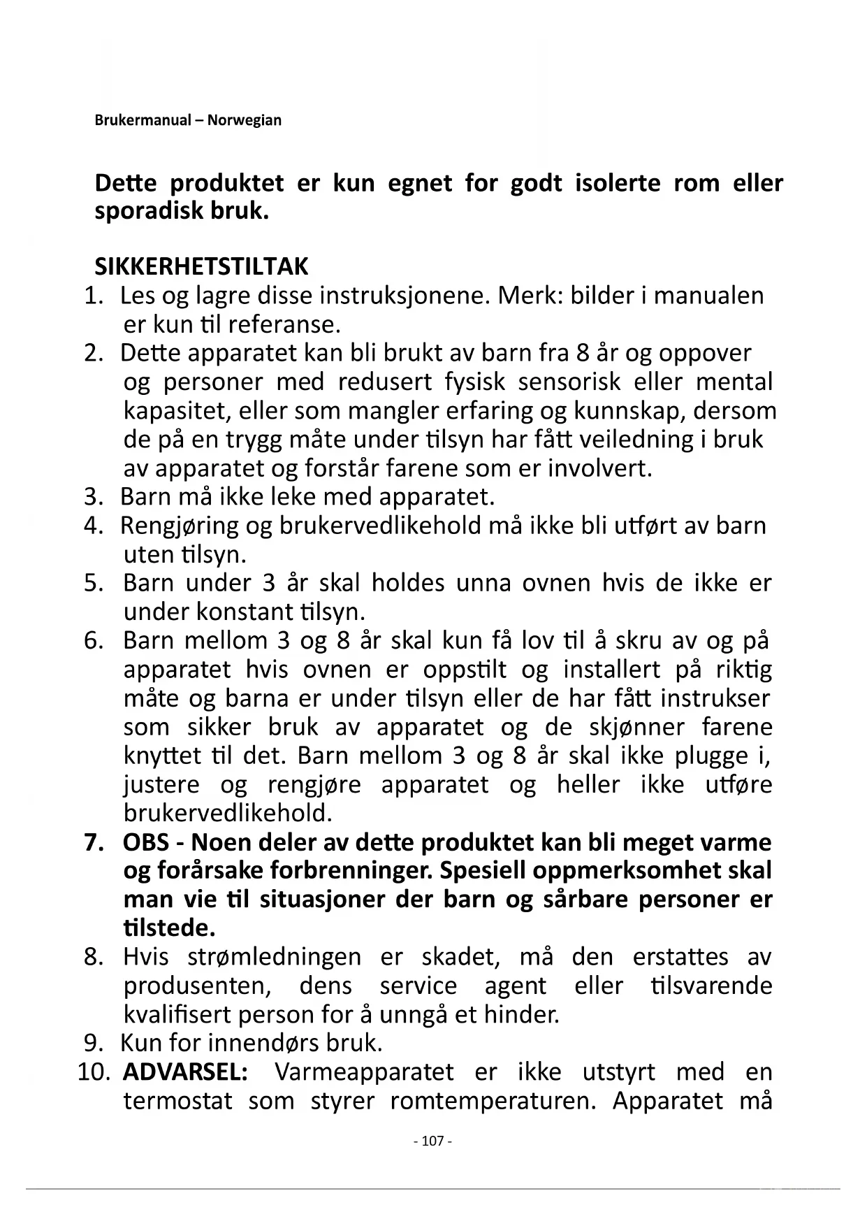 termostat som styrer romtemperaturen. Apparatet må- 108 - ikke brukes i små rom der det er personer som ikke klarer å forlate rommet på egen hånd, med mindre de er under kontinuerlig oppsyn.