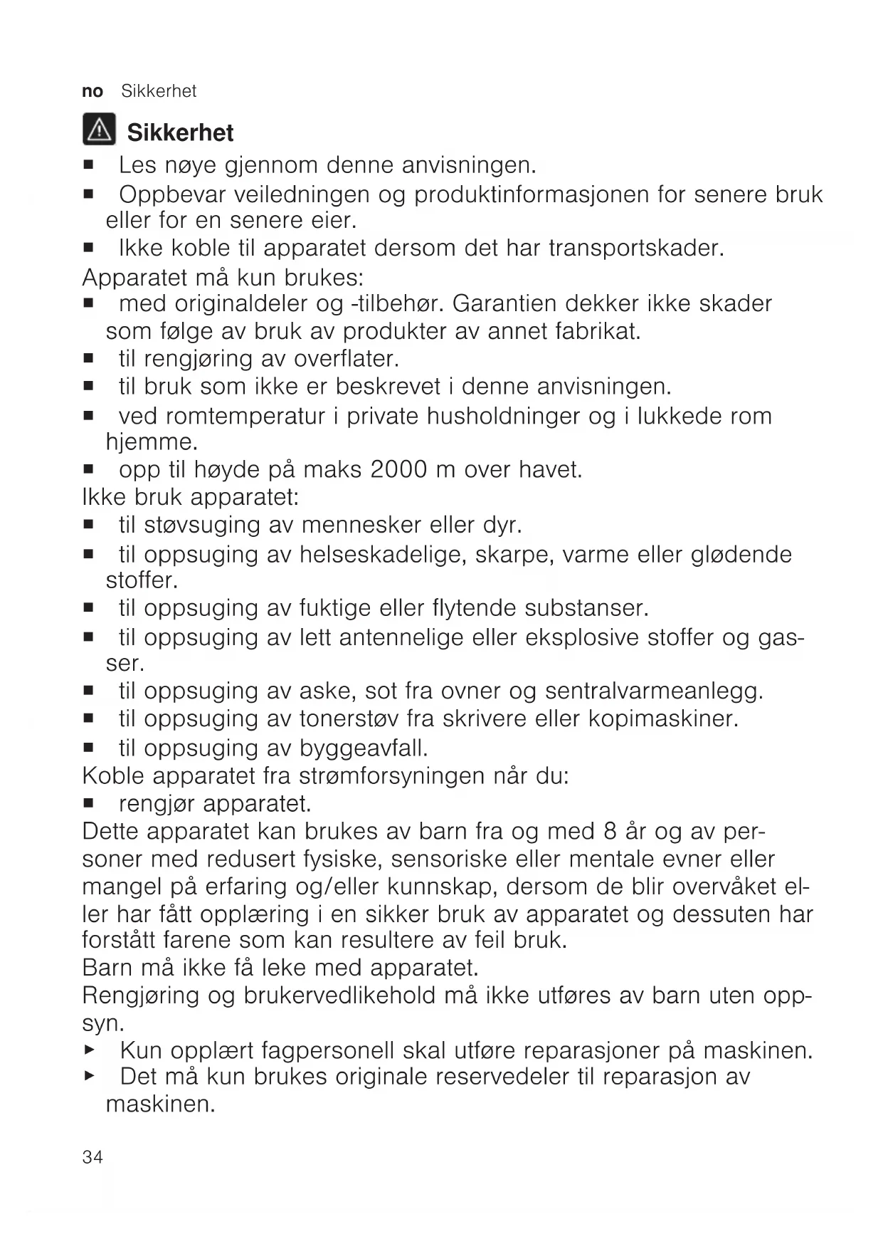 Sikkerhet ¡ Les nøye gjennom denne anvisningen. ¡ Oppbevar veiledningen og produktinformasjonen for senere bruk eller for en senere eier. ¡ Ikke koble til apparatet dersom det har transportskader. Apparatet må kun brukes: ¡ med originaldeler og -tilbehør. Garantien dekker ikke skader som følge av bruk av produkter av annet fabrikat. ¡ til rengjøring av overflater. ¡ til bruk som ikke er beskrevet i denne anvisningen. ¡ ved romtemperatur i private husholdninger og i lukkede rom hjemme. ¡ opp til høyde på maks 2000m over havet. Ikke bruk apparatet: ¡ til støvsuging av mennesker eller dyr. ¡ til oppsuging av helseskadelige, skarpe, varme eller glødende stoffer. ¡ til oppsuging av fuktige eller flytende substanser. ¡ til oppsuging av lett antennelige eller eksplosive stoffer og gas- ser. ¡ til oppsuging av aske, sot fra ovner og sentralvarmeanlegg. ¡ til oppsuging av tonerstøv fra skrivere eller kopimaskiner. ¡ til oppsuging av byggeavfall. Koble apparatet fra strømforsyningen når du: ¡ rengjør apparatet. Dette apparatet kan brukes av barn fra og med 8 år og av per- soner med redusert fysiske, sensoriske eller mentale evner eller mangel på erfaring og/eller kunnskap, dersom de blir overvåket el- ler har fått opplæring i en sikker bruk av apparatet og dessuten har forstått farene som kan resultere av feil bruk. Barn må ikke få leke med apparatet. Rengjøring og brukervedlikehold må ikke utføres av barn uten opp- syn. ▶ Kun opplært fagpersonell skal utføre reparasjoner på maskinen. ▶ Det må kun brukes originale reservedeler til reparasjon av maskinen.Sikkerhet no