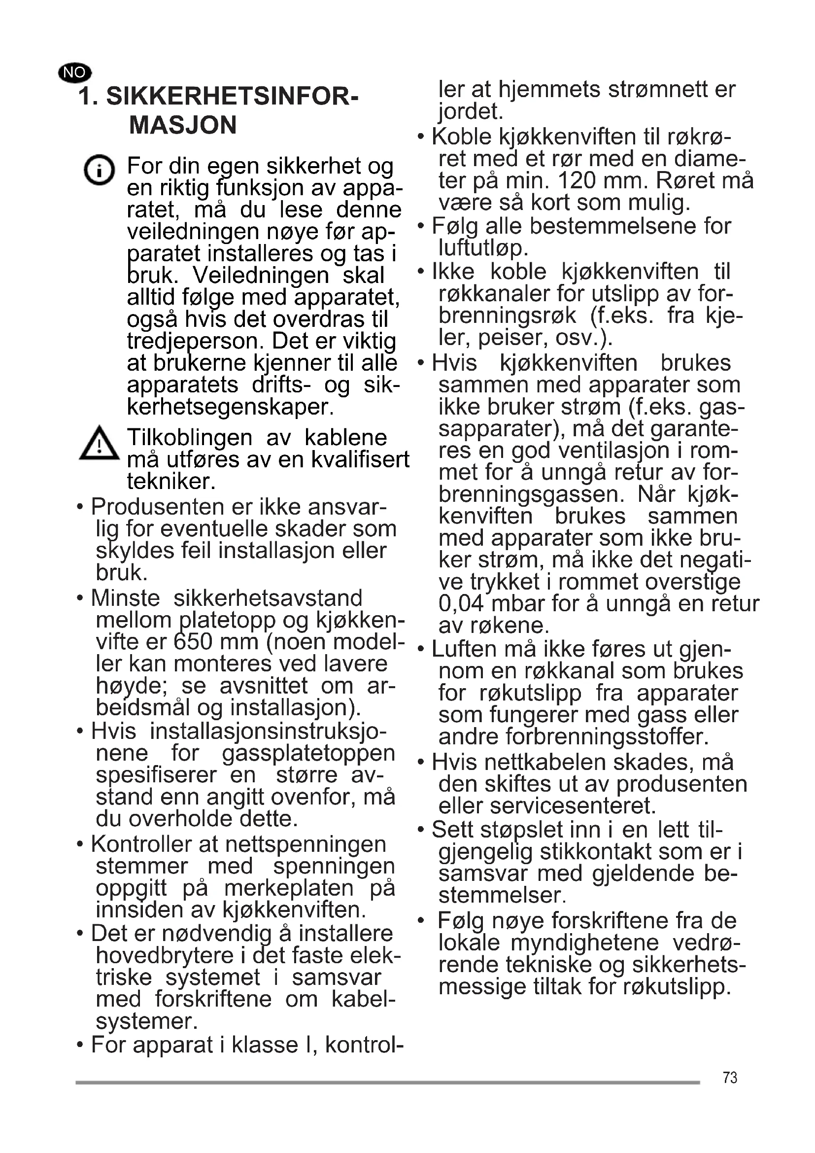- Følg nøye forskriftene fra de lokale myndighetene vedrø- rende tekniske og sikkerhets- messige tiltak for røkutslipp. 73ADVARSEL: Fjern be- skyttelsesfilmene før kjøk- kenviften installeres.