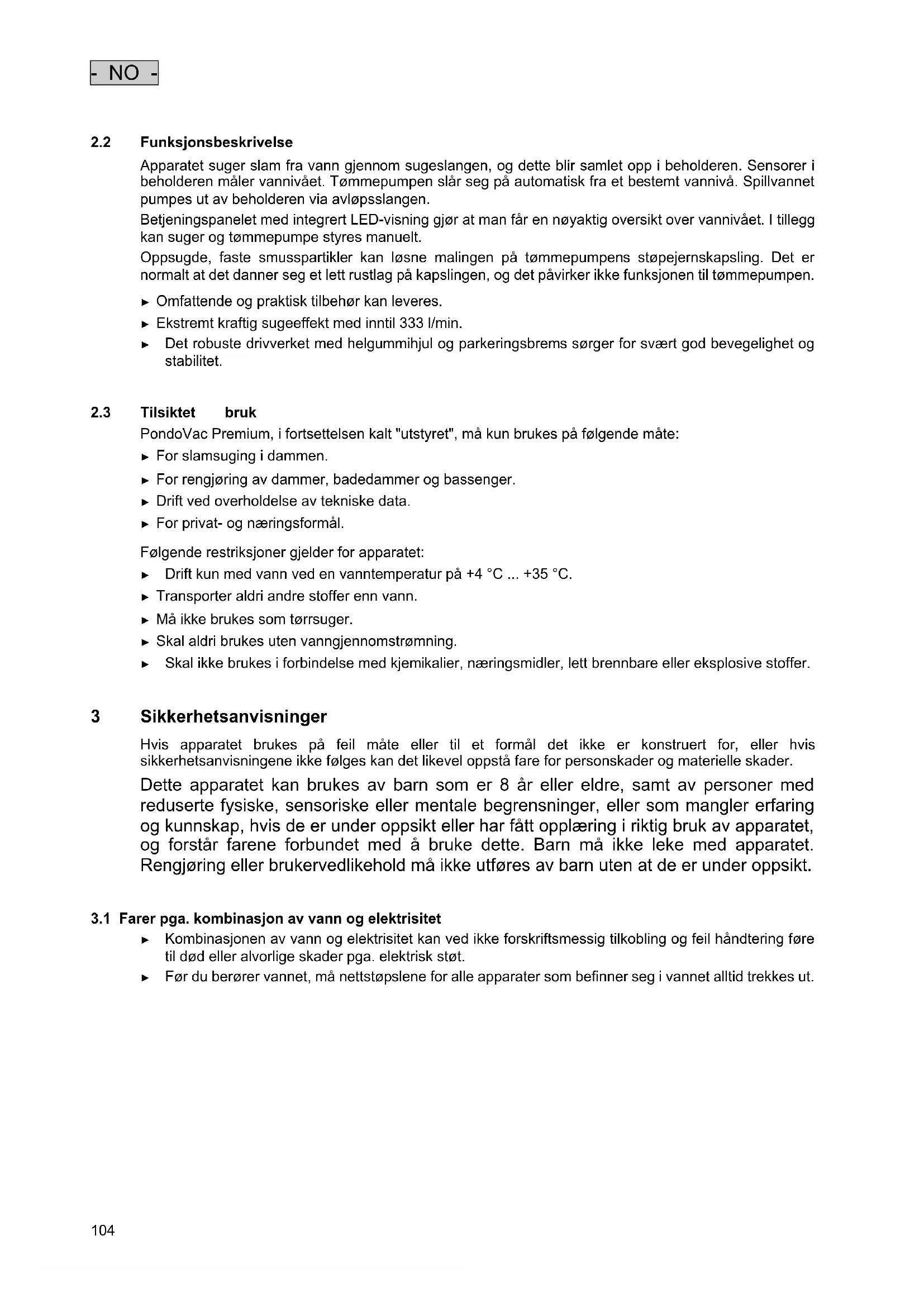Følgende restriksjoner gjelder for apparatet: ► Drift kun med vann ved en vanntemperatur på +4 °C ... +35 °C. ► Transporter aldri andre stoffer enn vann. ► Må ikke brukes som tørrsuger. ► Skal aldri brukes uten vanngjennomstrømning. ► Skal ikke brukes i forbindelse med kjemikalier, næringsmidler, lett brennbare eller eksplosive stoffer.