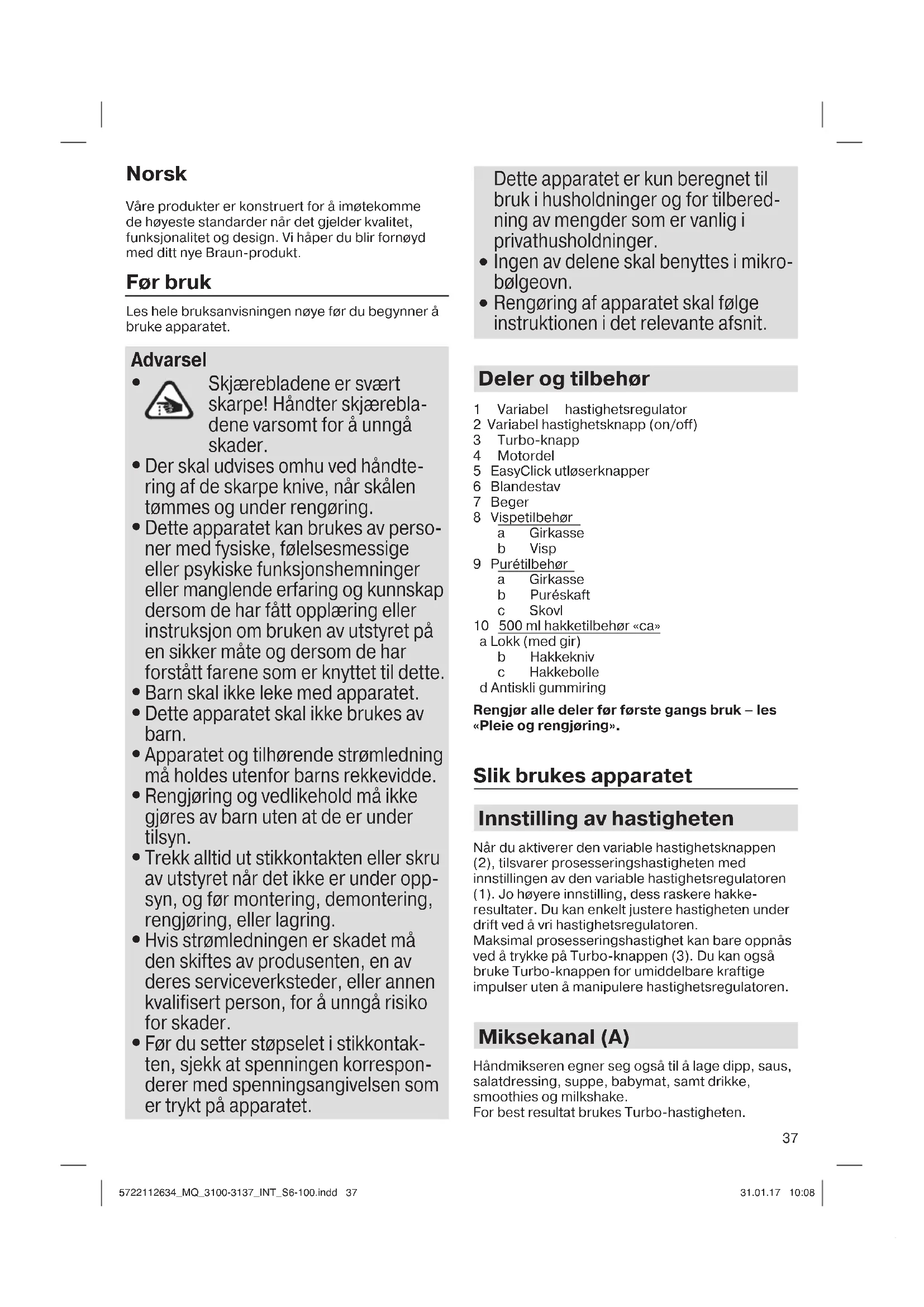 Rengøring af apparatet skal følge instruktionen i det relevante afsnit. Deler og tilbehør 1 Variabel hastighetsregulator 2 Variabel hastighetsknapp (on/off) 3 Turbo-knapp 4 Motordel 5 EasyClick utløserknapper 6 Blandestav 7 Beger 8 Vispetilbehør a Girkasse b Visp 9 Purétilbehør a Girkasse b Puréskaft c Skovl 10 500 ml hakketilbehør «ca» a Lokk (med gir) b Hakkekniv c Hakkebolle d Antiskli gummiring Rengjør alle deler før første gangs bruk – les «Pleie og rengjøring». Slik brukes apparatet Innstilling av hastigheten Når du aktiverer den variable hastighetsknappen (2), tilsvarer prosesseringshastigheten med innstillingen av den variable hastighetsregulatoren (1). Jo høyere innstilling, dess raskere hakke- resultater. Du kan enkelt justere hastigheten under drift ved å vri hastighetsregulatoren. Maksimal prosesseringshastighet kan bare oppnås ved å trykke på Turbo-knappen (3). Du kan også bruke Turbo-knappen for umiddelbare kraftige impulser uten å manipulere hastighetsregulatoren. Miksekanal (A) Håndmikseren egner seg også til å lage dipp, saus, salatdressing, suppe, babymat, samt drikke, smoothies og milkshake. For best resultat brukes Turbo-hastigheten. 5722112634_MQ_3100-3137_INT_S6-100.indd 375722112634_MQ_3100-3137_INT_S6-100.indd 37 31.01.17 10:0831.01.17 10:0838 Montering og betjening