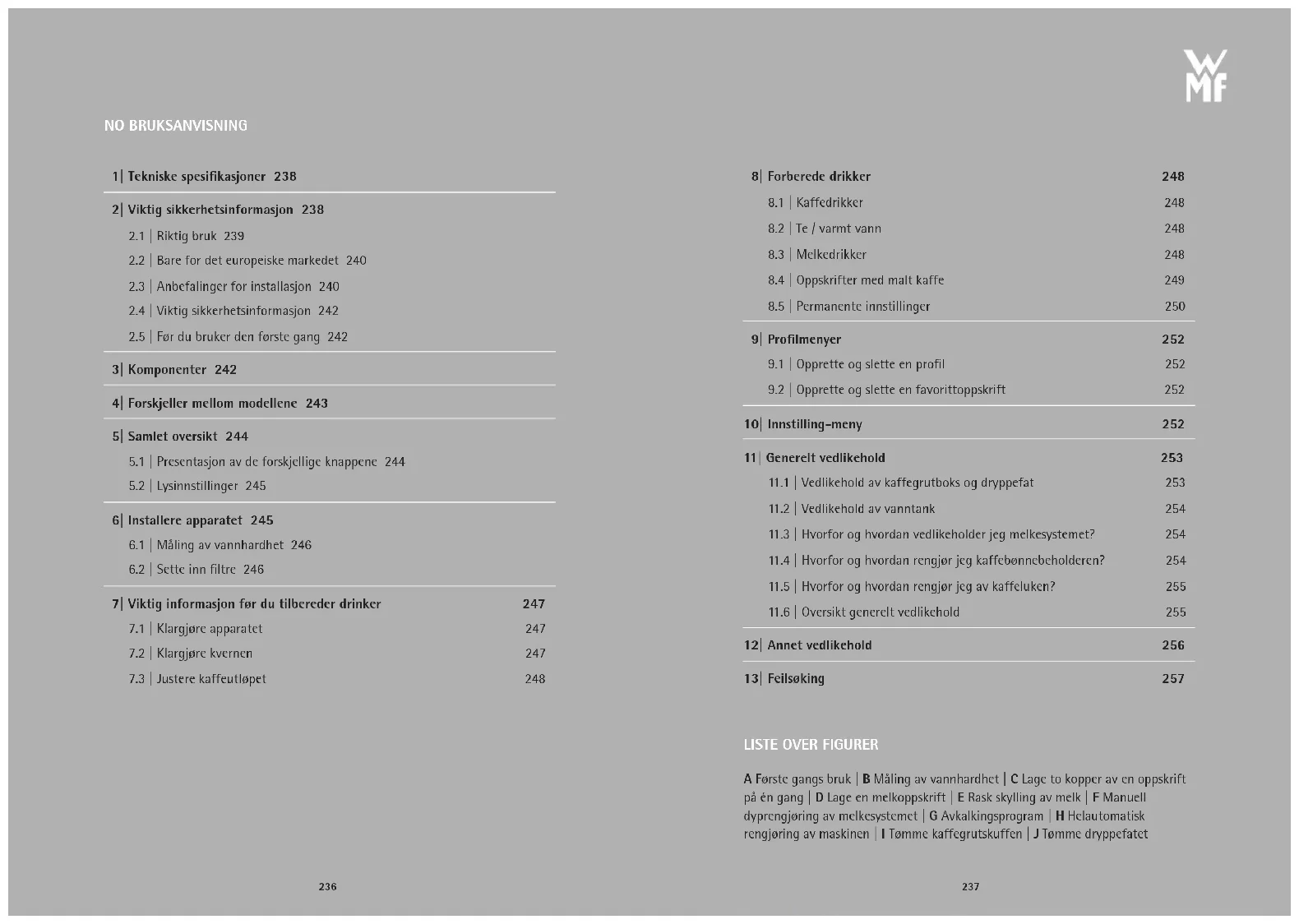 Generell drift Maskinen viser en feil, programvaren henger eller det er en feil på maskinen. Slå av og trekk ut stikkontakten, ta ut filteret, vent i ett minutt og start apparatet igjen. Trykk og hold på/av-knappen for å starte. Apparatet slås ikke på når du trykker på PÅ/AV-knappen. Kontroller sikringene og stikkontaktene. Kontroller at kontakten er satt i på riktig måte. Strømbrudd oppstår under en syklus. Apparatet starter automatisk på nytt når strømmen slås på igjen. Følg deretter instruksjonene på skjermen om nødvendig. Apparatet ber om å blir koblet fra strøm og koblet til igjen. Koble fra apparatet i 20 sekunder, fjern Claris Aqua Filter System, og koble det deretter til igjen. Kontakt WMF kundeserviceteam hvis feilen fortsetter. Bruk Kaffekvernen lager en merkelig lyd. Det er mest sannsynlig fremmedlegemer i kvernen. Prøv å fjerne dem med en støvsuger, eller ta kontakt med WMF kundeserviceteam. Malingsgradmarkøren er vanskelig å manipulere. Endre kverninnstillingen bare når den er i gang. Apparatet produserer ikke kaffe eller noen annen ønsket oppskrift. Det er oppdaget et problem under tilberedningen av drikken. Apparatet har startet på nytt automatisk og er klart for en ny syklus. Du har brukt malt kaffe i stedet for kaffebønner i kaffebønnebeholderen. Bruk støvsuger til å fjerne malt kaffe fra kaffebønnebeholderen. Legg bare kaffebønner i kaffebønnebeholderen, unngå andre produkter (for eksempel krydder) Kaffebønnevarselet er slått på, selv om det er kaffebønner i beholderen Du kan åpne lokket og riste bønnene med hånden. Unngå å bruke oljete, karamelliserte eller smaksatte kaffebønner som ikke går lett inn i kvernen. Det er vann under apparatet. Før du tar ut vanntanken, må du vente i 15 sekunder etter at kaffen er ferdig med å renne, slik at apparatet er ferdig med syklusen. Kontroller at dryppefatet er riktig plassert på maskinen. det skal alltid være på plass, selv når apparatet ikke er i bruk. Dryppefatet skal ikke fjernes under en syklus. Det er vann i kaffegrutskuffen. Hvis det renner noe vann på apparatets øvre deksel, føres det direkte til kaffegrutskuffen. Unngå å stable en full kopp på toppen av apparatet.