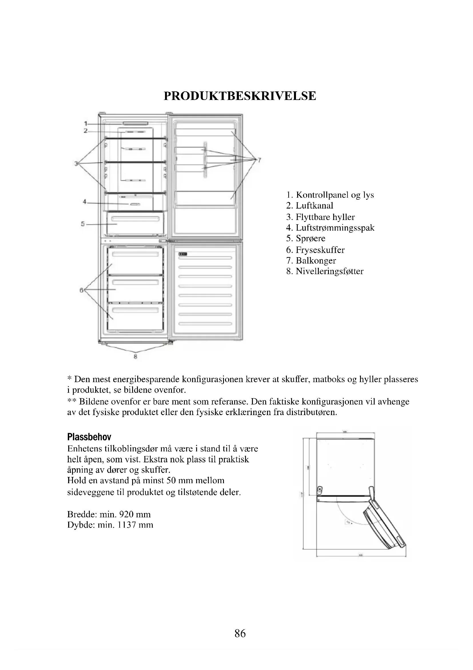 - Den mest energibesparende konfigurasjonen krever at skuffer, matboks og hyller plasseres i produktet, se bildene ovenfor. ** Bildene ovenfor er bare ment som referanse. Den faktiske konfigurasjonen vil avhenge av det fysiske produktet eller den fysiske erklæringen fra distributøren. Plassbehov Enhetens tilkoblingsdør må være i stand til å være helt åpen, som vist. Ekstra nok plass til praktisk åpning av dører og skuffer. Hold en avstand på minst 50 mm mellom sideveggene til produktet og tilstøtende deler. Bredde: min. 920 mm Dybde: min. 1137 mm87 BRUK AV/PÅ-tasten, brukes til å slå apparatet av/på. INNSTILLING-tast som brukes til å justere temperaturen eller til å velge Super Cool-funksjonen. Super Cool-ikon viser hvis funksjonen er aktivert.