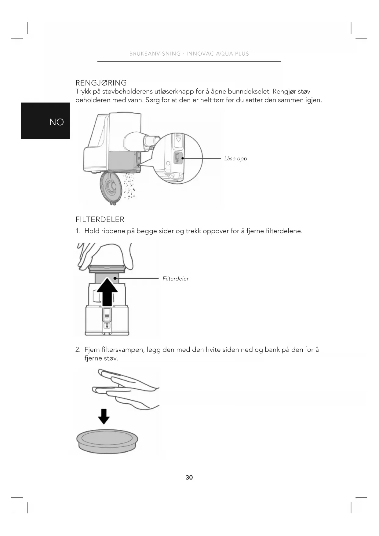 RENGJØRING Trykk på støvbeholderens utløserknapp for å åpne bunndekselet. Rengjør støv- beholderen med vann. Sørg for at den er helt tørr før du setter den sammen igjen. FILTERDELER