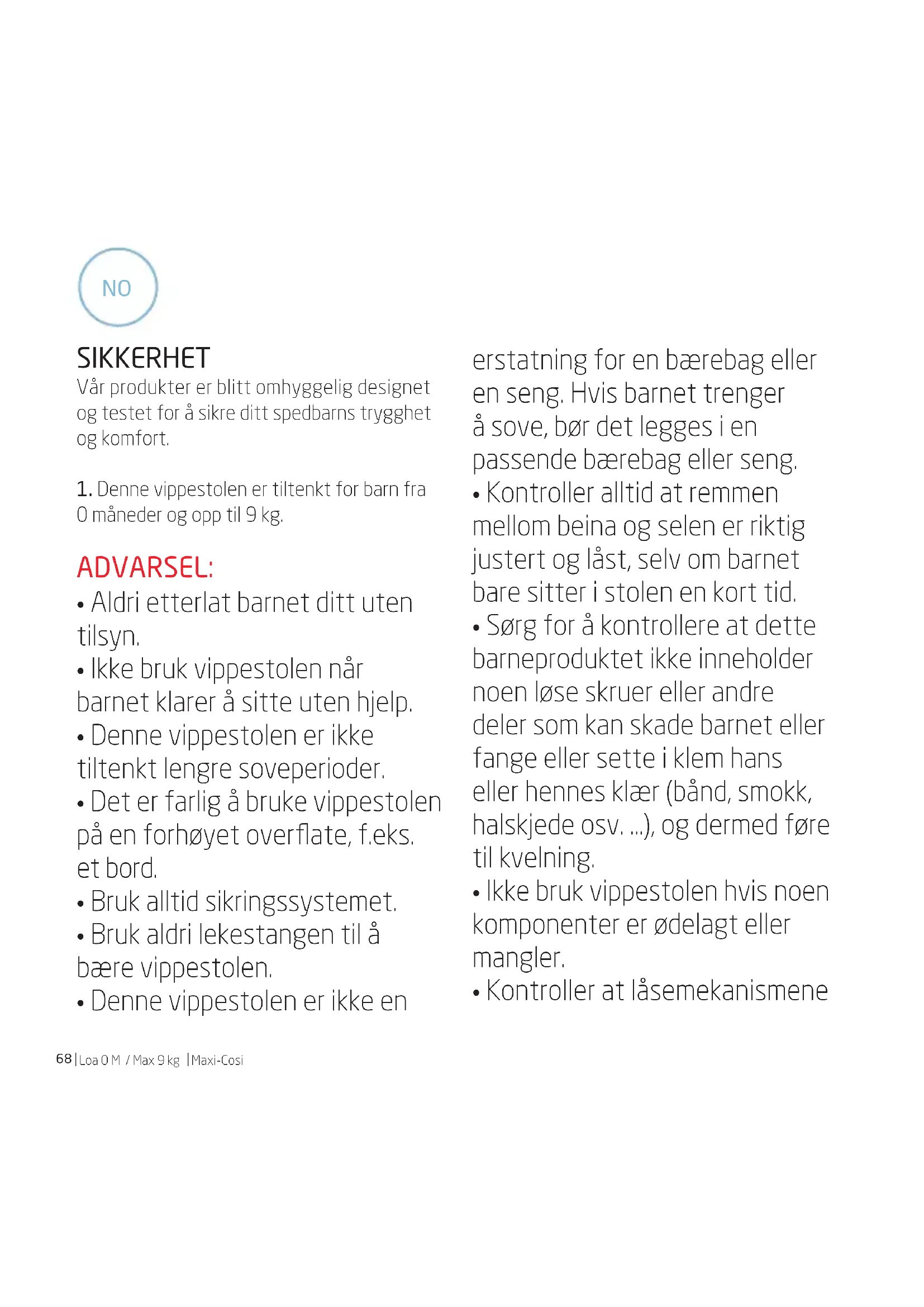 - Denne vippestolen er ikke en erstatning for en bærebag eller en seng. Hvis barnet trenger å sove, bør det legges i en passende bærebag eller seng.