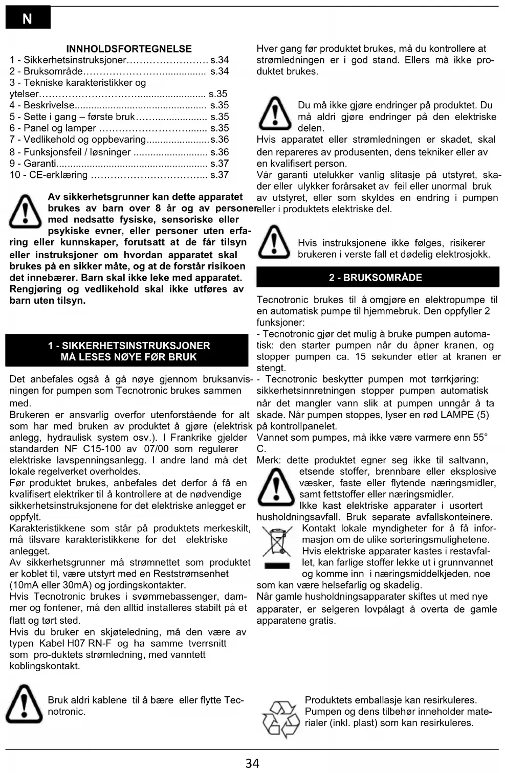 Merk: dette produktet egner seg ikke til saltvann, etsende stoffer, brennbare eller eksplosive væsker, faste eller flytende næringsmidler, samt fettstoffer eller næringsmidler. Ikke kast elektriske apparater i usortert husholdningsavfall. Bruk separate avfallskonteinere. Kontakt lokale myndigheter for å få infor- masjon om de ulike sorteringsmulighetene. Hvis elektriske apparater kastes i restavfal- let, kan farlige stoffer lekke ut i grunnvannet og komme inn i næringsmiddelkjeden, noe som kan være helsefarlig og skadelig. Når gamle husholdningsapparater skiftes ut med nye apparater, er selgeren lovpålagt å overta de gamle apparatene gratis. Produktets emballasje kan resirkuleres. Pumpen og dens tilbehør inneholder mate- rialer (inkl. plast) som kan resirkuleres. N35