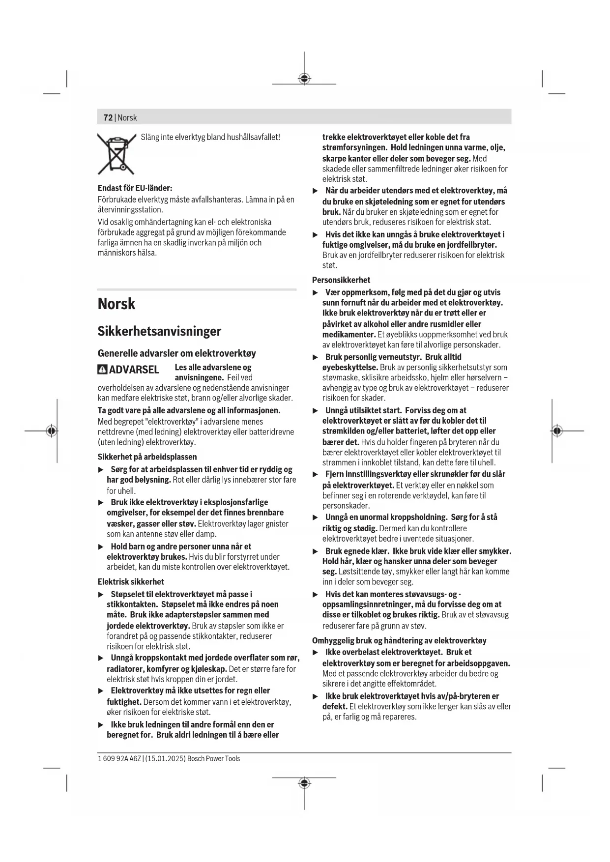 kg 1,7 1,8 1,5 Kapslingsgrad / II / II / II A) Vekt uten strømkabel og uten nettstøpsel Angivelsene gjelder for merkespenning [U] på 230 V. Ved avvikende spenning og på utførelser for bestemte land kan disse angivelsene variere. Verdiene kan variere avhengig av produktet, bruksområdet og miljøforholdene. Du finner mer informasjon på www.bosch-professional.com/wac. Støy-/vibrasjonsinformasjon