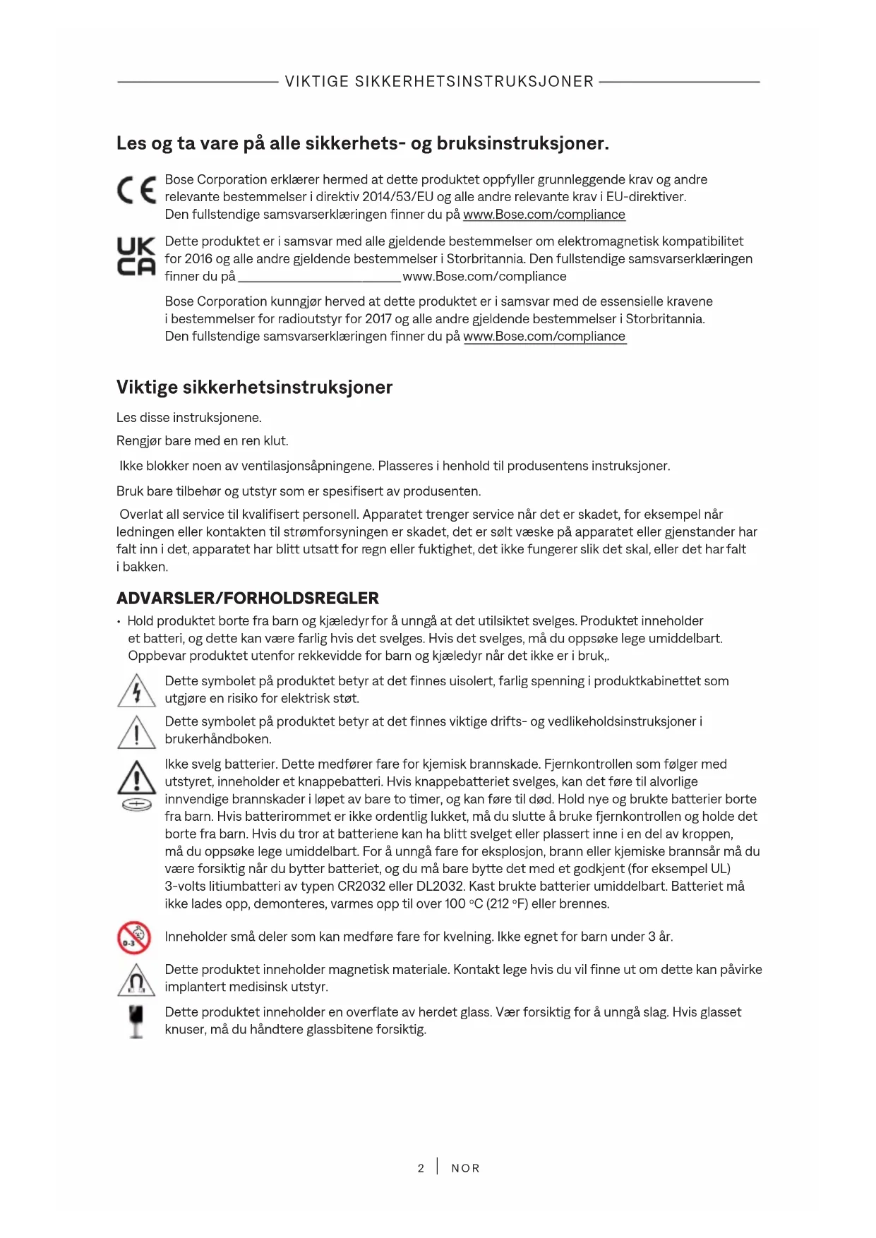 NOR Les og ta vare på alle sikkerhets- og bruksinstruksjoner. Bose Corporation erklærer hermed at dette produktet oppfyller grunnleggende krav og andre relevante bestemmelser i direktiv 2014/53/EU og alle andre relevante krav i EU-direktiver. Den fullstendige samsvarserklæringen finner du på www.Bose.com/compliancewww.Bose.com/compliance Dette produktet er i samsvar med alle gjeldende bestemmelser om elektromagnetisk kompatibilitet for 2016 og alle andre gjeldende bestemmelser i Storbritannia. Den fullstendige samsvarserklæringen finner du på www.Bose.com/compliancewww.Bose.com/compliance Bose Corporation kunngjør herved at dette produktet er i samsvar med de essensielle kravene i bestemmelser for radioutstyr for 2017 og alle andre gjeldende bestemmelser i Storbritannia. Den fullstendige samsvarserklæringen finner du på www.Bose.com/compliancewww.Bose.com/compliance Viktige sikkerhetsinstruksjoner Les disse instruksjonene. Rengjør bare med en ren klut. Ikke blokker noen av ventilasjonsåpningene. Plasseres i henhold til produsentens instruksjoner. Bruk bare tilbehør og utstyr som er spesifisert av produsenten. Overlat all service til kvalifisert personell. Apparatet trenger service når det er skadet, for eksempel når ledningen eller kontakten til strømforsyningen er skadet, det er sølt væske på apparatet eller gjenstander har falt inn i det, apparatet har blitt utsatt for regn eller fuktighet, det ikke fungerer slik det skal, eller det har falt i bakken. ADVARSLER/FORHOLDSREGLER