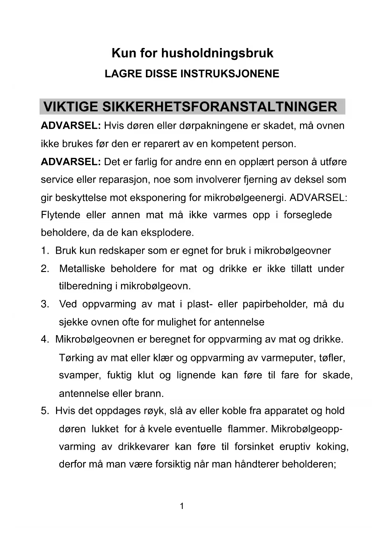 VIKTIGE SIKKERHETSFORANSTALTNINGER ADVARSEL: Hvis døren eller dørpakningene er skadet, må ovnen ikke brukes før den er reparert av en kompetent person. ADVARSEL: Det er farlig for andre enn en opplært person å utføre service eller reparasjon, noe som involverer fjerning av deksel som gir beskyttelse mot eksponering for mikrobølgeenergi. ADVARSEL: Flytende eller annen mat må ikke varmes opp i forseglede beholdere, da de kan eksplodere.