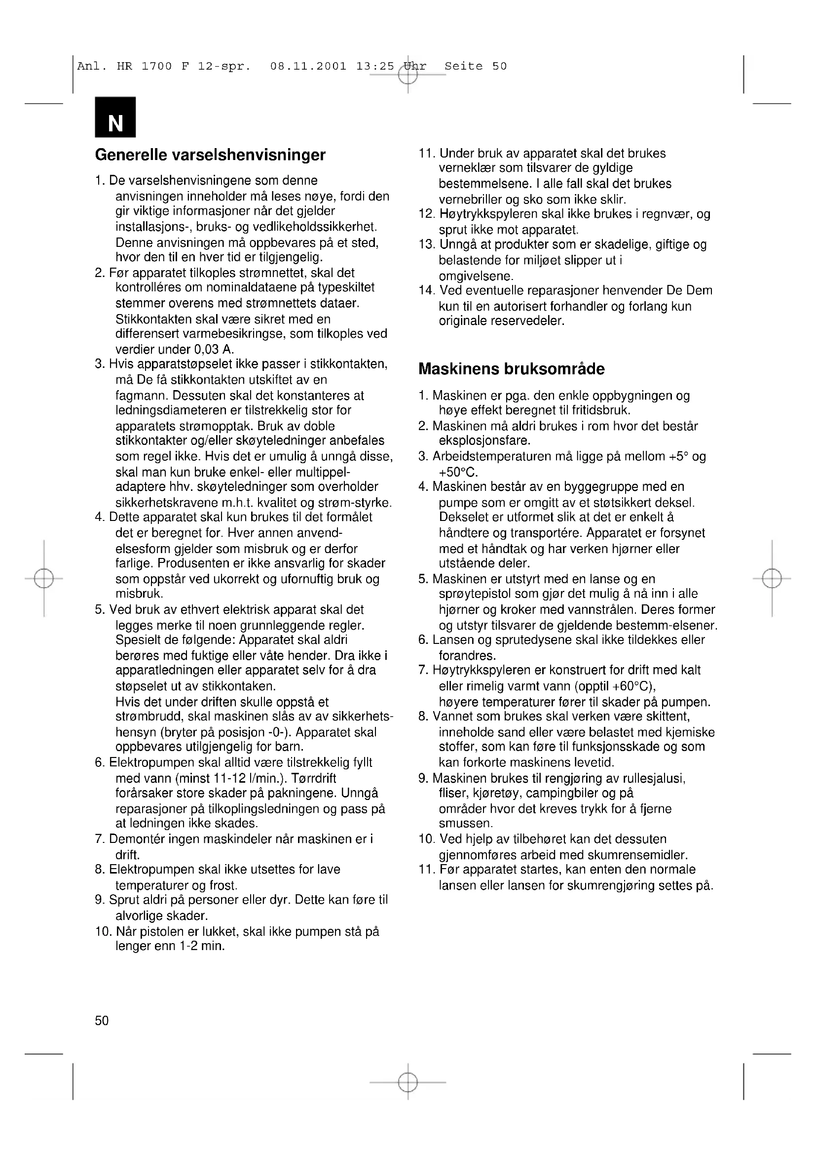 Rundbørsten blir ikke medlevért (spesialtilbehør) Anl. HR 1700 F 12-spr. 08.11.2001 13:25 Uhr Seite 52Innsuging av rengjøringsmiddel. Skumsprutelanse Til bruk av forskjellige vaskemiddel (se fig. nedenfor) Vedlikehold Smøring Elektropumpen er utstyrt med et smøresystem med lukket kretsløp. Oljetype: 15W40. Kontrollér sugefilteret med jevne mellomrom for å unngå tilstopping som kan utsette pumpens drift for fare (se fig.). Elektromotor Elektromotoren er utstyrt med en motorsikkerhetsbryter. Hvis motoren går seg varm, stopper den v.h.a. denne bryteren. Deretter skal man vente 5-10 min., før apparatet settes igang igjen. Finn årsaken til feilen. El-kabel Den elektriske kabelen må ikke skades. Ved en skade må den skiftes ut av en fagmann. Koplingsskjema Reparasjons- og reservedelsbehov Vennligs henvend Dem til vårt service-senter ved eventuelle feil hhv. ved bruk for reservedeler. Renovasjon av maskinen Med en gang maskinen ikke lenger kan brukes, skal den behandles på følgende måte: Dra ut el-kabelen og sørg for at apparatet ikke kan starte. Oppbevar apparatet utilgjengelig for barn. Ingen av delene til den gamle maskinen skal brukes som reservedeler. Demontér maskinen og sørg for renovasjon av enkeltdelene ifølge de lovmessige bestemmelsene.