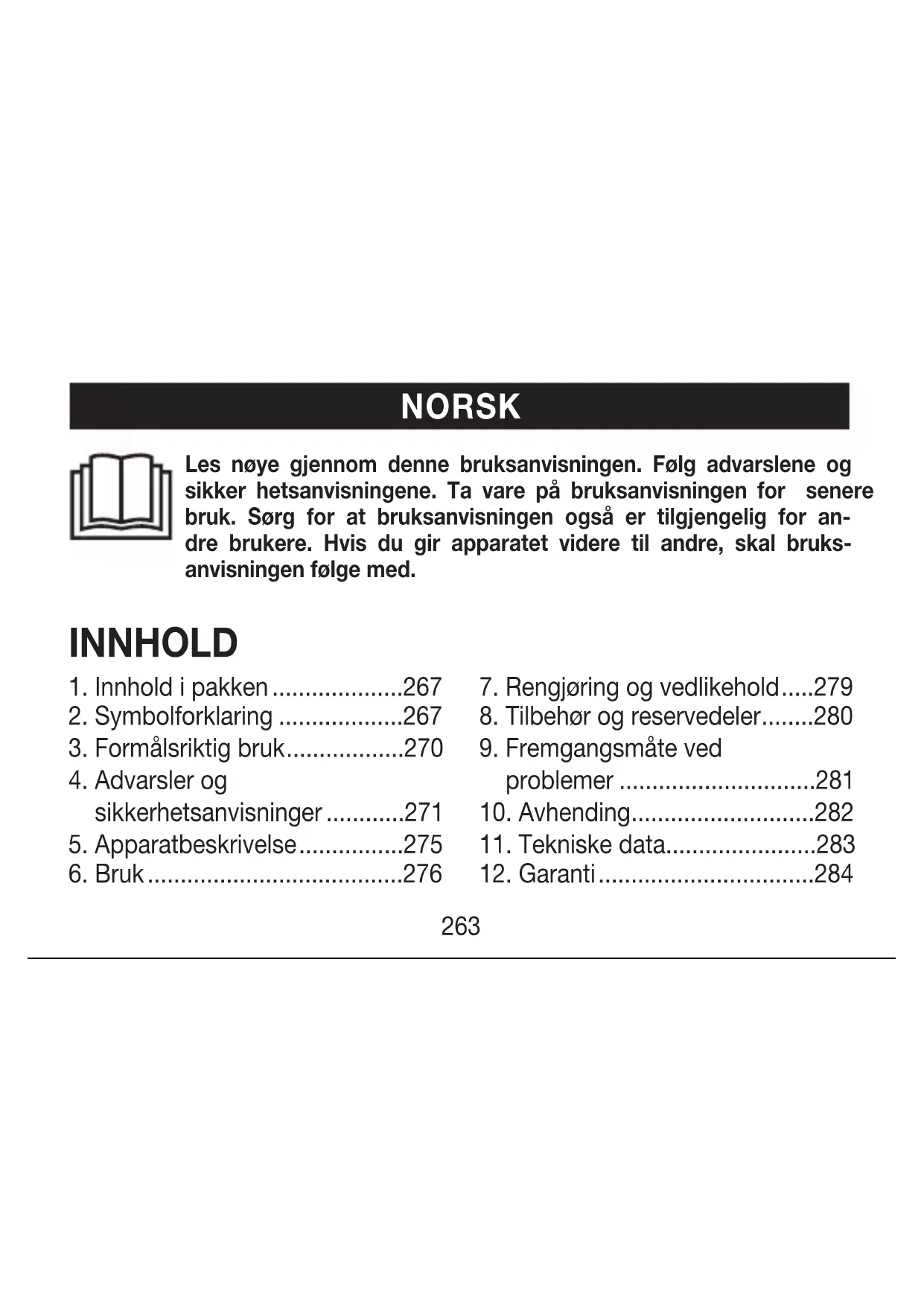 Følgende symboler brukes på selve apparatet, i bruksanvisningen, på emballasjen og på apparatets typeskilt: ADVARSEL Indikerer en mulig fare. Hvis faren ikke unngås, kan det føre til dødsfall eller alvorlige personskader.268 FORSIKTIG Indikerer en mulig fare. Hvis faren ikke unngås, kan det føre til lette eller mindre personskader. VARSEL Indikerer en mulig skadelig situasjon. Hvis den ikke unngås, kan det føre til skade på enheten eller noe i omgivelsene. Produktinformasjon Varsel om viktig informasjon Les bruksanvisningen Kildesorter emballasjekomponentene, og kast dem i henhold til lokale forskrifter. Apparat i beskyttelsesklasse II Apparatet er dobbelt verneisolert og innfrir dermed kravene for beskyttelsesklasse 2269 Importørsymbol